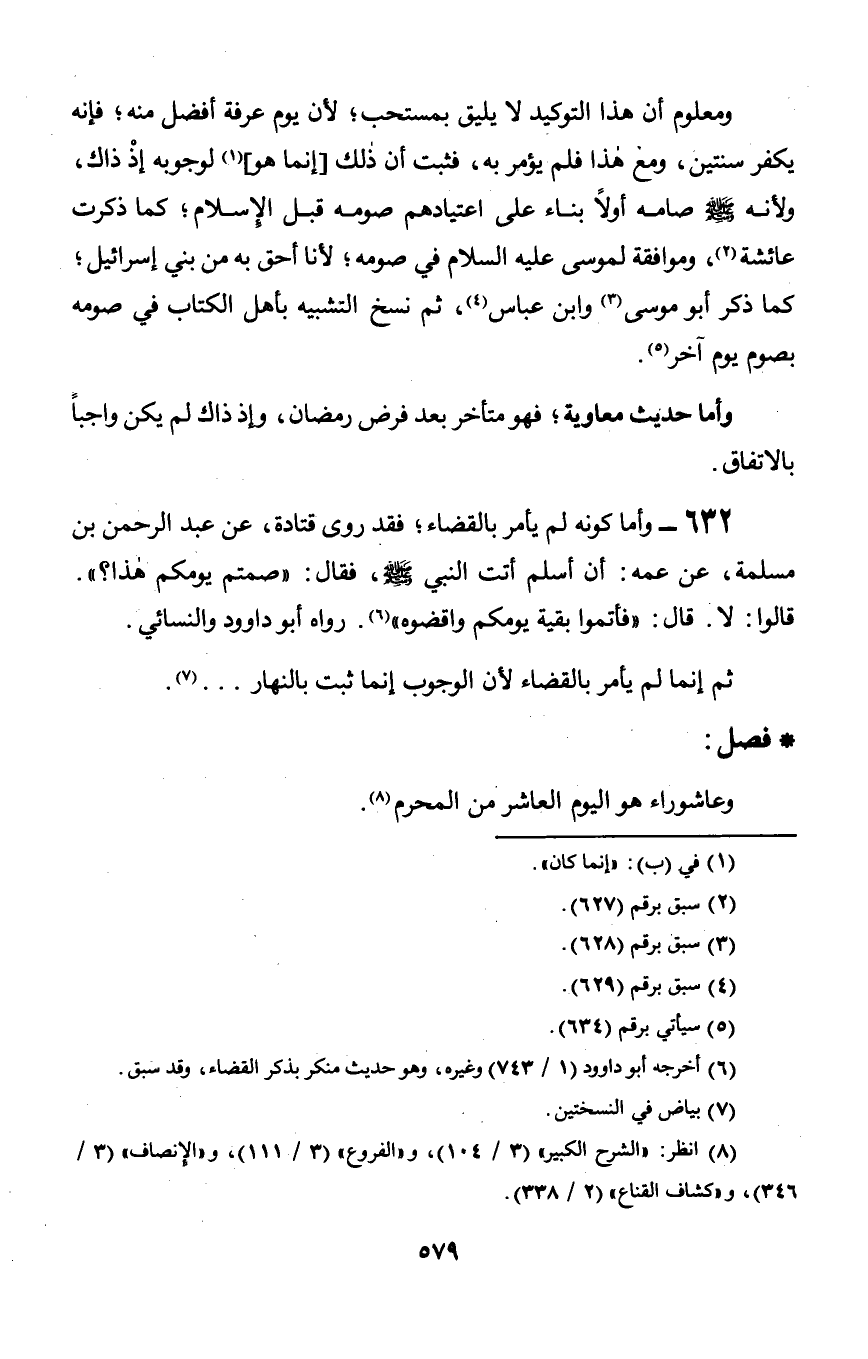 ومعلوم أن هذا التوكيد لا يليق بمستحب؛ لأن يوم عرفة أفضل منه؛ فإنه يكفر سنتين, ومع هذا فلم يؤمر به, فثبت أن ذلك [إنما هو لوجوبه إذْ ذاك, ولأنه صلى الله عليه وسلم صامه أولاً بناء على اعتيادهم صومه قبل الإِسلام؛ كما ذكرت عائشة, وموافقة لموسى عليه السلام في صومه؛؛ لأنا أحق به من بني إسرائيل؛ كما ذكر أبو موسى وابن عباس, ثم نسخ التشبيه بأهل الكتاب في صومه صوم يوم آخر.