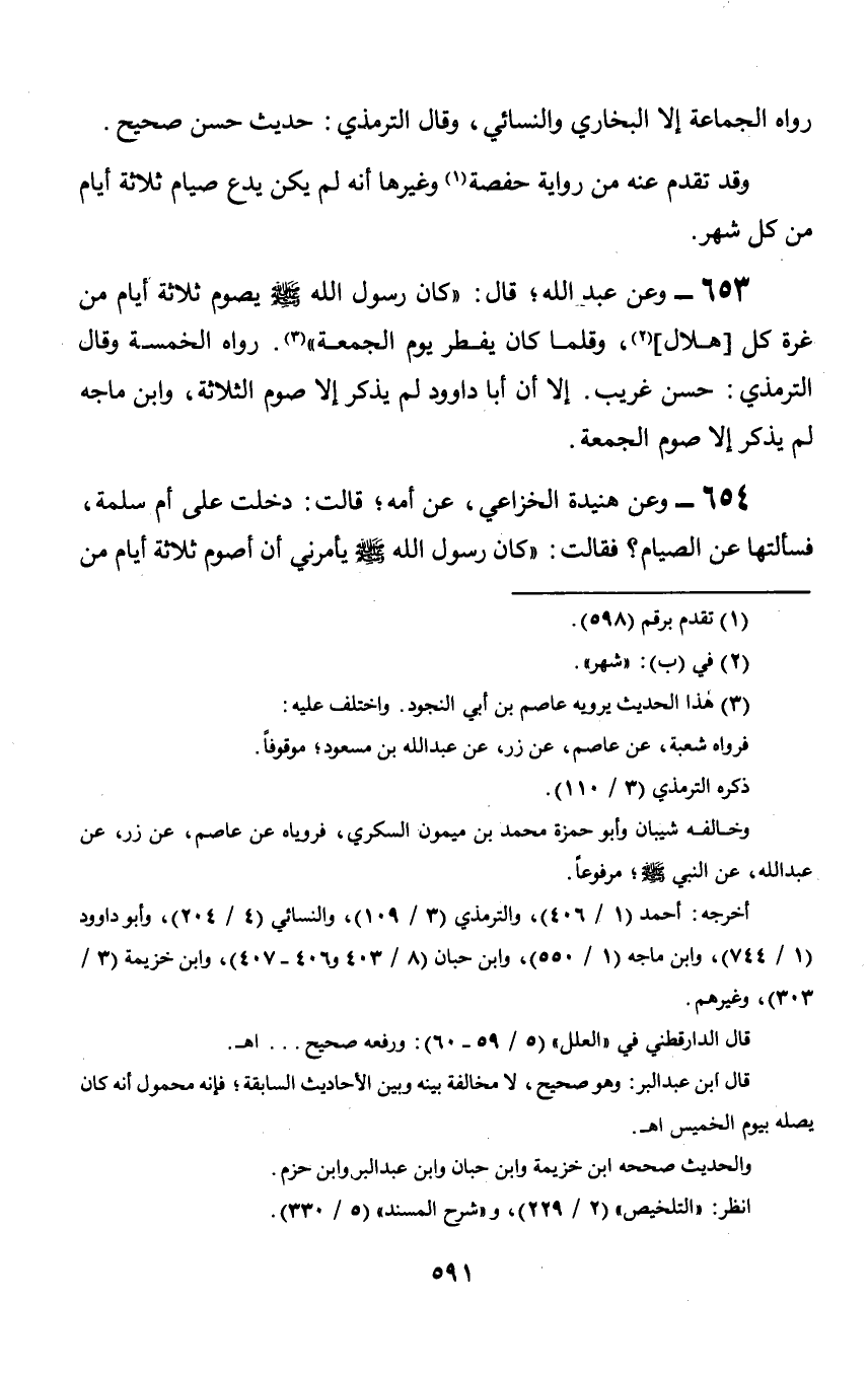 653 - وعن عبد الله؛ قال: «كان رسول الله صلى الله عليه وسلم يصوم ثلاثة أيام من غرة كل [هلال] , وقلما كان يفطر يوم الجمعة». رواه الخمسة وقال الترمذي حسن غريب. إلا أن أبا داوود لم يذكر إلا صوم الثلاثة, وابن ماجه لم يذكر إلا صوم الجمعة.