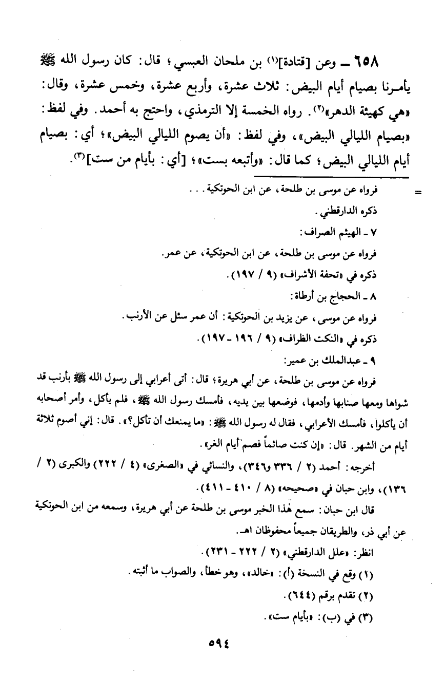 658 - وعن [قتادة] بن ملحان العبسي؛ قال: كان رسول الله صلى الله عليه وسلم يأمرنا بصيام أيام البيض: ثلاث عشرة, وأربع عشرة, وخمس عشرة, وقال: «هي كهيئة الدهر». رواه الخمسة إلا الترمذي, واحتج به أحمد. وفي لفظ: «أن يصوم الليالي البيض»؛ أي: بصيام أيام الليالي البيض؛ كما قال: «وأتبعه بست»؛ [أي: بأيام من ست].