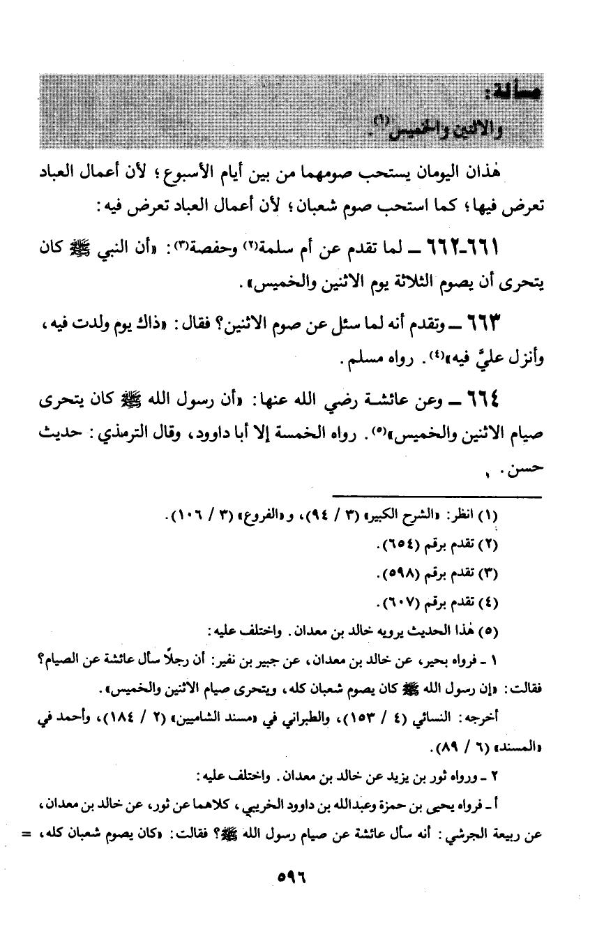 661 - 662 - لما تقدم عن أم سلمة وحفصة: «أن النبي صلى الله عليه وسلم كان يتحرى أن يصوم الثلاثة يوم الاثنين والخميس».