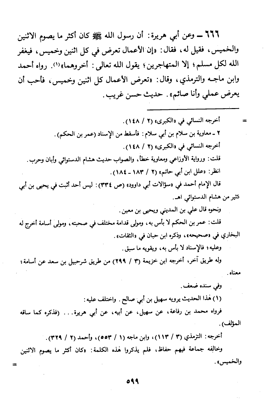 666 - وعن أبي هريرة: أن رسول الله صلى الله عليه وسلم كان أكثر ما يصوم الاثنين والخميس, فقيل له, فقال: «إن الأعمال تعرض في كل اثنين وخميس, فيغفر الله لكل مسلم؛ إلا المتهاجرين؛ يقول الله تعالى: أخروهما». رواه أحمد وابن ماجه والترمذي, وقال: «تعرض الأعمال كل اثنين وخميس, فأحب أن يعرض عملي وأنا صائم». حديث حسن غريب.