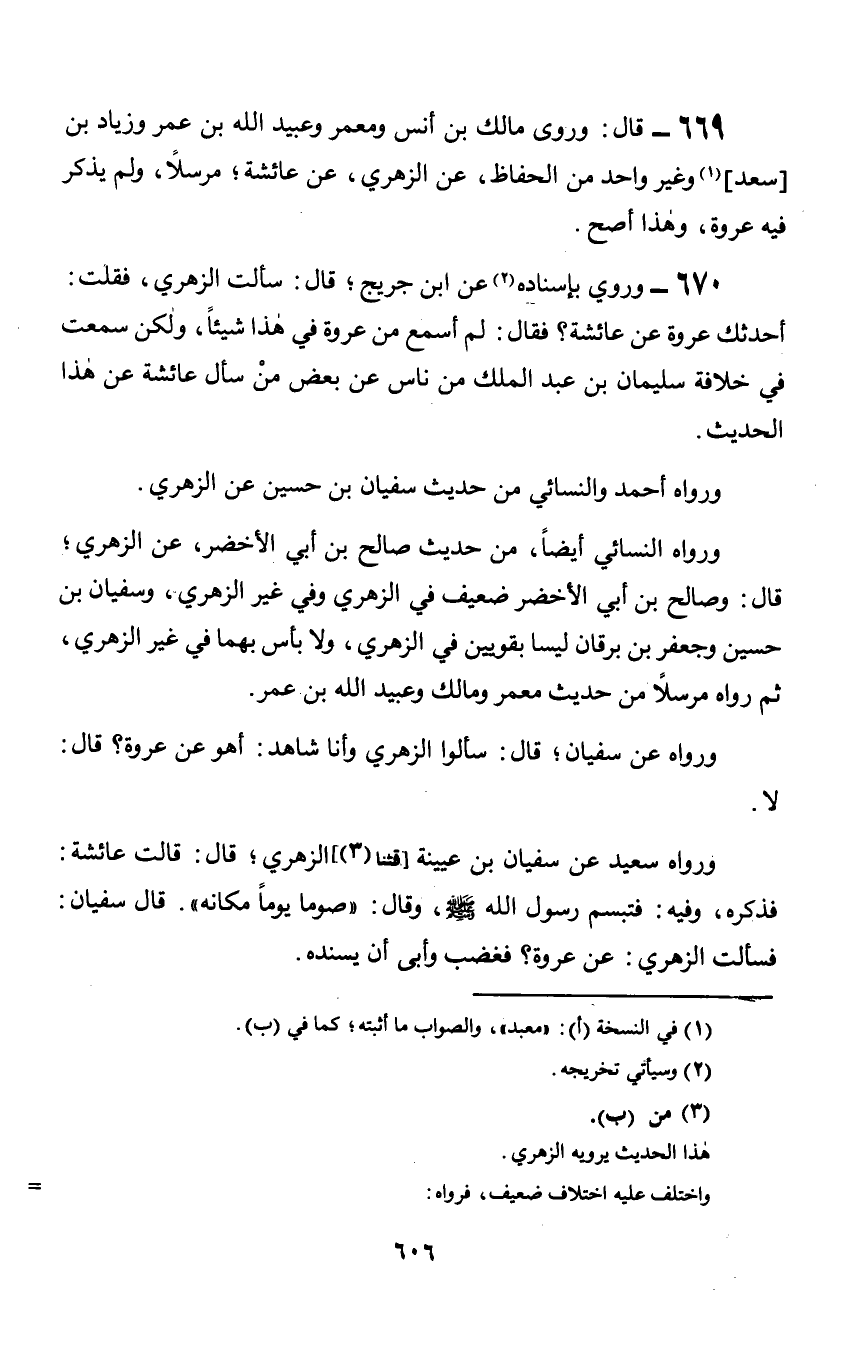 669 - قال: وروى مالك بن أنس ومعمر وعبيد الله بن عمر وزياد بن [سعد] وغير واحد من الحفاظ, عن الزهري, عن عائشة؛ مرسلاً, ولم يذكر فيه عروة, وهذا أصح.