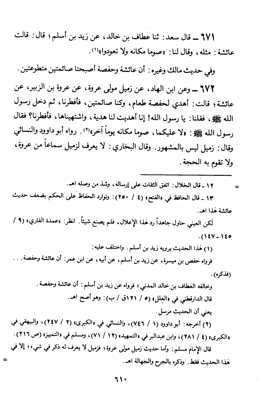 672 - وعن ابن الهاد, عن زميل مولى عروة, عن عروة بن الزبير, عن عائشة؛ قالت: أهدي لحفصة طعام, وكنا صائمتين, فأفطرنا, ثم دخل رسول الله صلى الله عليه وسلم, فقلنا: يا رسول الله! إنا أهديت لنا هدية, واشتهيناها, فأفطرنا؟ فقال رسول الله صلى الله عليه وسلم: «لا عليكما, صوما يوماً آخر». رواه أبو داوود والنسائي وقال: زميل ليس بالمشهور. وقال البخاري: لا يعرف لزميل سماعاً عن عروة, ولا تقوم به الحجة.