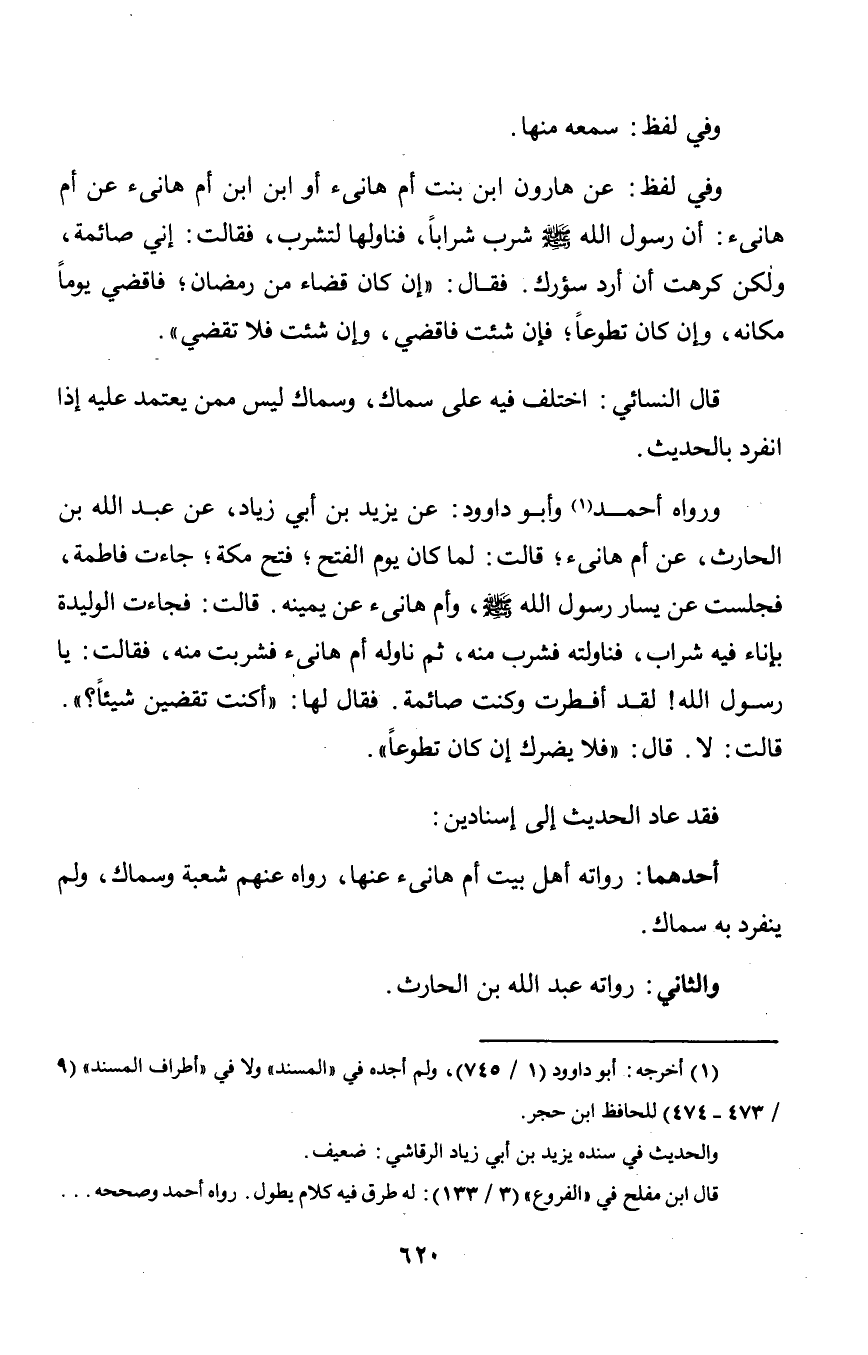 ورواه أحمد وأبو داوود: عن يزيد بن أبي زياد, عن عبد الله بن الحارث, عن أم هانئ؛ قالت: لما كان يوم الفتح؛ فتح مكة؛ جاءت فاطمة, فجلست عن يسار رسول الله صلى الله عليه وسلم, وأم هانئ عن يمينه. قالت: فجاءت الوليدة بإناء فيه شراب, فناولته فشرب منه, ثم ناوله أم هانئ فشربت منه, فقالت: يا رسول الله! لقد أفطرت وكنت صائمة. فقال لها: «أكنت تقضين شيئاً؟». قالت: لا. قال: «فلا يضرك إن كان تطوعاً».