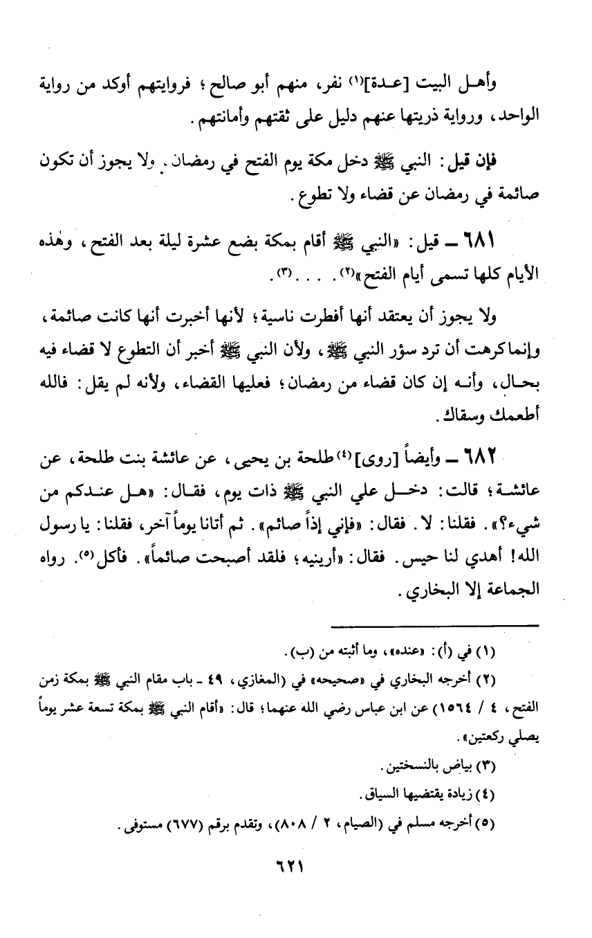 682 - وأيضاً [روى] طلحة بن يحيى, عن عائشة بنت طلحة, عن عائشة؛ قالت: دخل علي النبي صلى الله عليه وسلم ذات يوم, فقال: «هل عندكم من شيء؟». فقلنا: لا. فقال: «فإني إذاً صائم». ثم أتانا يوماً آخر, فقلنا: يا رسول الله! أهدي لنا حيس. فقال: «أرينيه؛ فلقد أصبحت صائماً». فأكل. رواه الجماعة إلا البخاري.