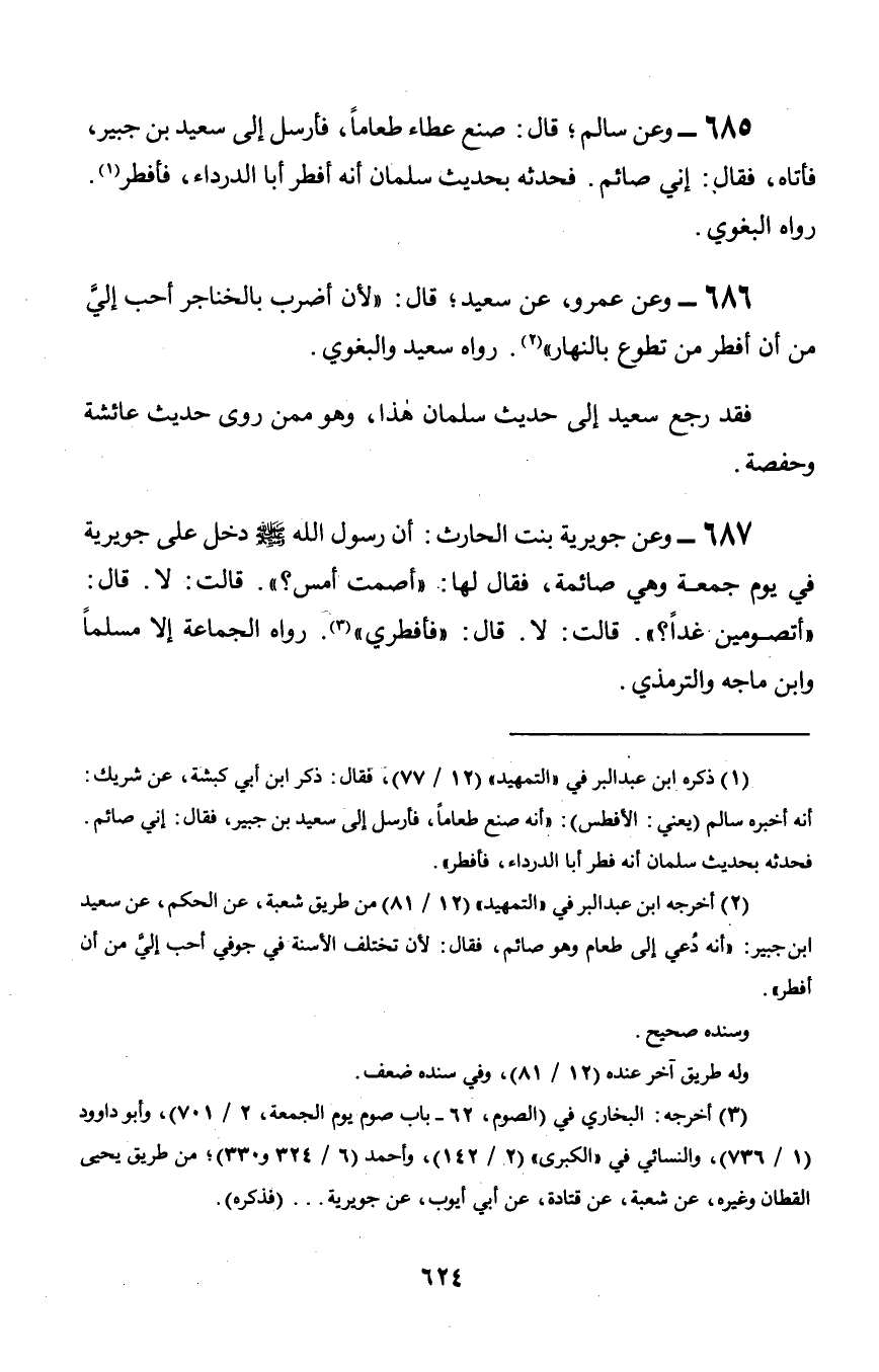 685 - وعن سالم؛ قال: صنع عطاء طعاماً, فأرسل إلى سعيد بن جبير, فأتاه, فقال: إني صائم. فحدثه بحديث سلمان أنه أفطر أبا الدرداء, فأفطر. رواه البغوي.