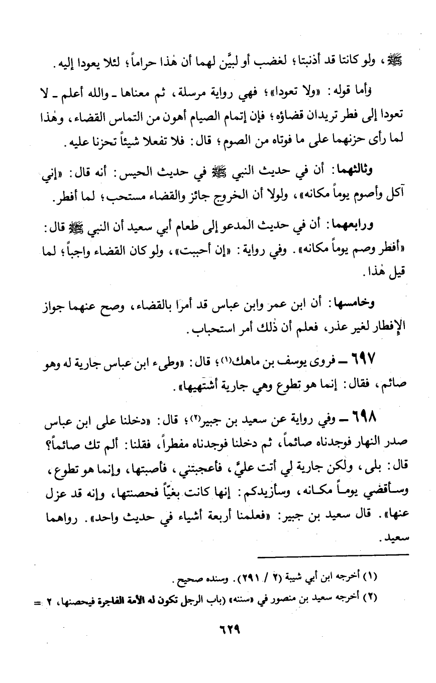 698 - وفي رواية عن سعيد بن جبير؛ قال: «دخلنا على ابن عباس صدر النهار فوجدناه صائماً, ثم دخلنا فوجدناه مفطراً, فقلنا: ألم تك صائماً؟ قال: بلى, ولكن جارية لي أتت عليَّ, فأعجبتني, فأصبتها, وإنما هو تطوع, وسأقضي يوماً مكانه, وسأزيدكم: إنها كانت بغيّاً فحصنتها, وإنه قد عزل عنها». قال سعيد بن جبير: «فعلمنا أربعة أشياء في حديث واحد». رواهما سعيد.