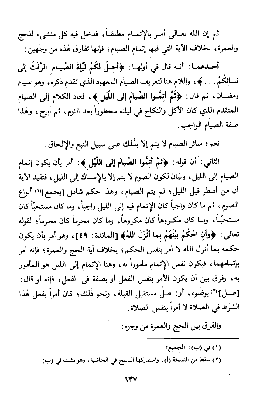 الثاني: أن قوله: {ثُمَّ أَتِمُّوا الصِّيَامَ إِلَى اللَّيْلِ}: أمر بأن يكون إتمام الصيام إلى الليل, وبيان لكون الصوم لا يتم إلا بالإِمساك إلى الليل, فتفيد الآية أن من أفطر قبل الليل؛ لم يتم الصيام, وهذا حكم شامل [يجمع] أنواع الصوم, ثم ما كان واجباً كان الإِتمام فيه إلى الليل واجباً, وما كان مستحبّاً كان مستحبّاً, وما كان مكروهاً كان مكروهاً, وما كان محرماً كان محرماً؛ لقوله تعالى: {وَأَنِ احْكُمْ بَيْنَهُمْ بِمَا أَنْزَلَ اللَّهُ} [المائدة: 49] , وهو أمر بأن يكون حكمه بما أنزل اتلله لا أمر بنفس الحكم؛ بخلاف آية الحج والعمرة؛ فإنه أمر بإتمامهما, فيكون نفس الإِتمام مأموراً به, وهنا الإِتمام إلى الليل هو المأمور به, وفرق بأن يكون الأمر بنفس الفعل أو بصفة في الفعل؛ فإنه لو قال: [صل] بوضوء, أو: صلِّ مستقبل القبلة, ونحو ذلك؛ كان أمراً بفعل هذا الشرط في الصلاة لا أمراً بنفس الصلاة.
