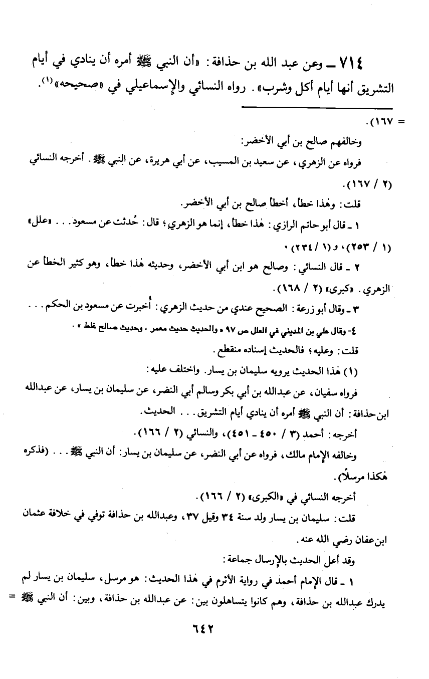 714 - وعن عبد تالله بن حذافة: «أن النبي صلى الله عليه وسلم أمره أن ينادي في أيام التشريق أنها أيام أكل وشرب». رواه النسائي والإِسماعيلي في «صحيحه».