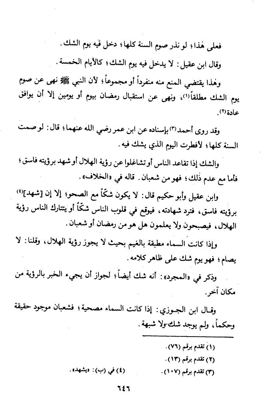 وابن عقيل وأبو حكيم قال: لا يكون شكّاً مع الصحو؛ إلا أن [شهد] برؤيته فاسق, فترد شهادته, فيوقع في قلوب الناس شكّاً أو يتتارك الناس رؤية الهلال, فيصبحون لا يعلمون هل هو من رمضان أو شعبان.