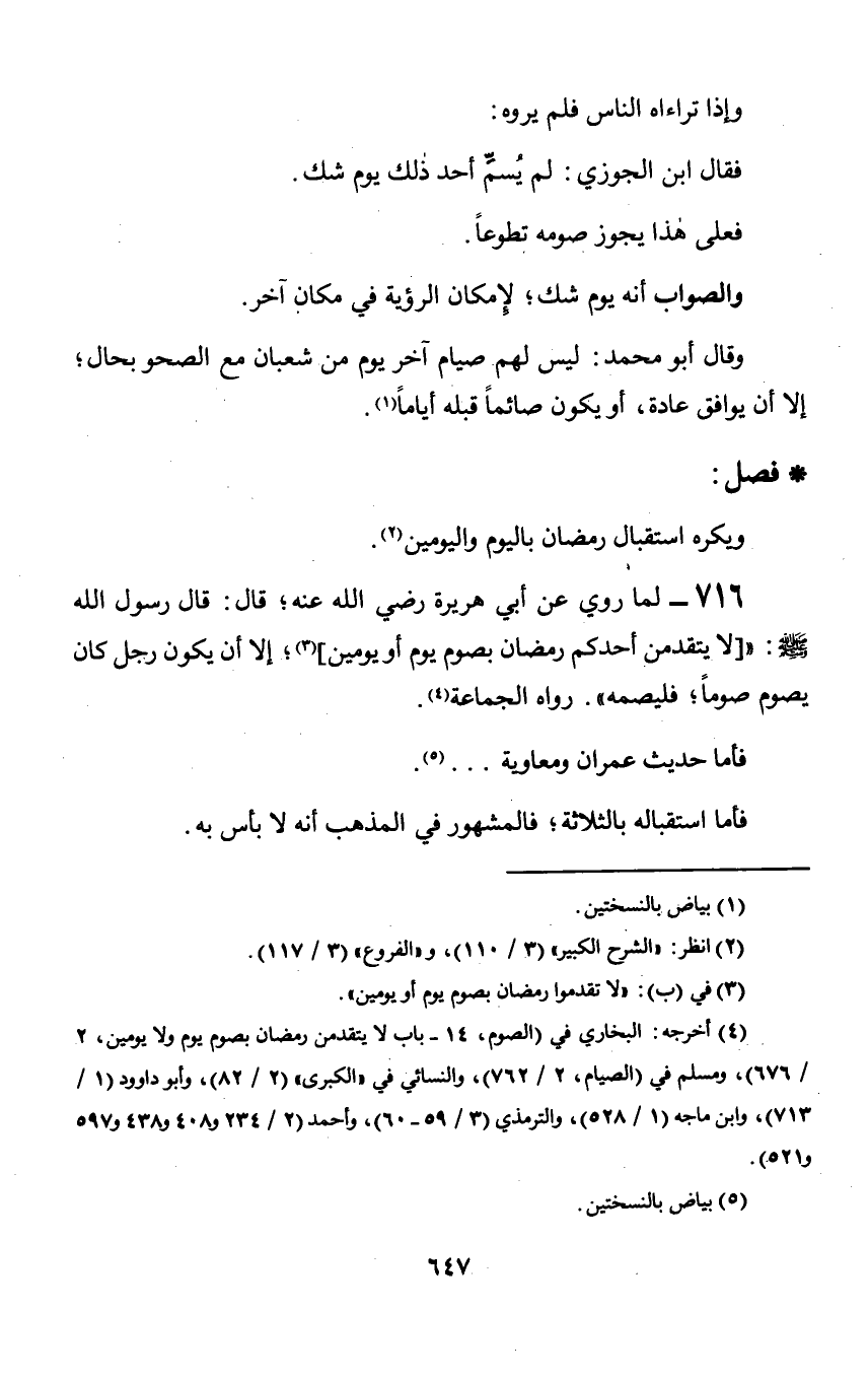 716 - لما روي عن أبي هريرة رضي الله عنه؛ قال: قال رسول الله صلى الله عليه وسلم: «[لا يتقدمن أحدكم رمضان بصوم يوم أو يومين]؛ إلا أن يكون رجل كان يصوم صوماً؛ فليصمه». رواه الجماعة.