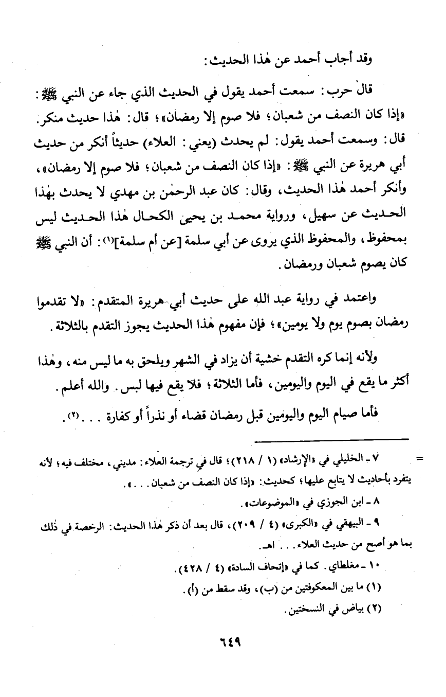 قال حرب: سمعت أحمد يقول في الحديث الذي جاء عن النبي صلى الله عليه وسلم: «إذا كان النصف من شعبان؛ فلا صوم إلا رمضان»؛ قال: هذا حديث منكر. قال: وسمعت أحمد يقول: لم يحدث (يعني: العلاء) حديثاً أنكر من حديث أبي هريرة عن النبي صلى الله عليه وسلم: «إذا كان النصف من شعبان؛ فلا صوم إلا رمضان» , وأنكر أحمد هذا الحديث, وقال: كان عبد الرحمن بن مهدي لا يحدث بهذا الحديث عن سهيل, ورواية محمد بن يحيى الكحال هذا الحديث ليس بمحفوظ, والمحفوظ الذي يروى عن أبي سلمة [عن أم سلمة]: أن النبي صلى الله عليه وسلم كان يصوم شعبان ورمضان.