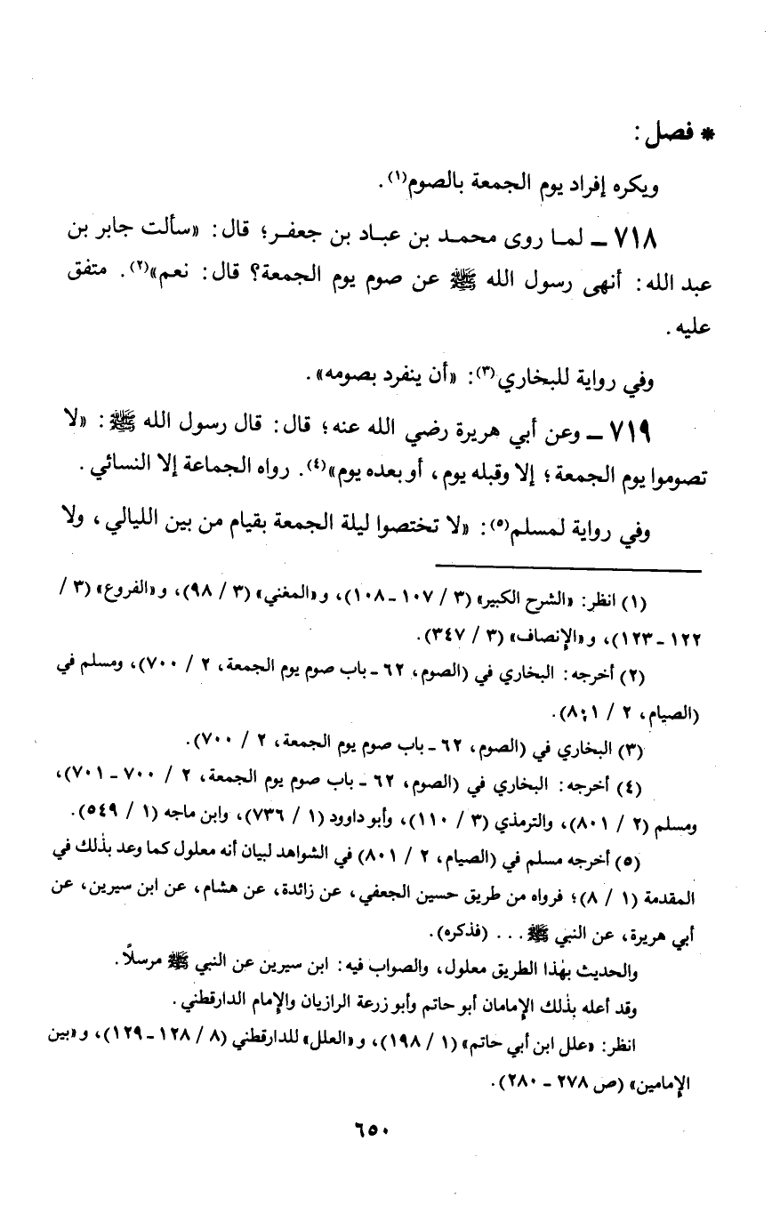 718 - لما روى محمد بن عباد بن جعفر؛ قال: «سألت جابر بن عبد الله: أنهى رسول الله صلى الله عليه وسلم عن صوم يوم الجمعة؟ قال: نعم». متفق عليه.
