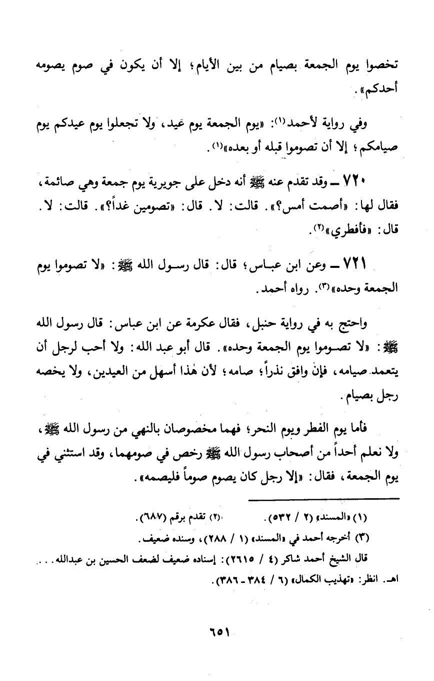 720 - وقد تقدم عنه صلى الله عليه وسلم أنه دخل على جويرية يوم جمعة وهي صائمة, فقال لها: «أصمت أمس؟». قالت: لا. قال: «تصومين غداً؟». قالت: لا. قال: «فأفطري».