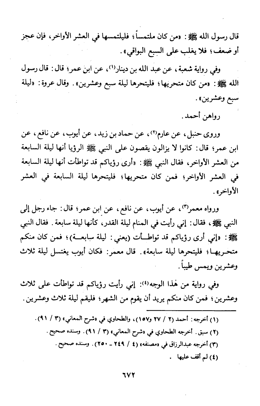 وروى حنبل, عن عارم, عن حماد بن زيد, عن أيوب, عن نافع, عن ابن عمر؛ قال: كانوا لا يزالون يقصون على النبي صلى الله عليه وسلم الرؤيا أنها ليلة السابعة من العشر الأواخر؛ فمن كان متحريها؛ فليتحرها ليلة السابعة في العشر الأواخر».