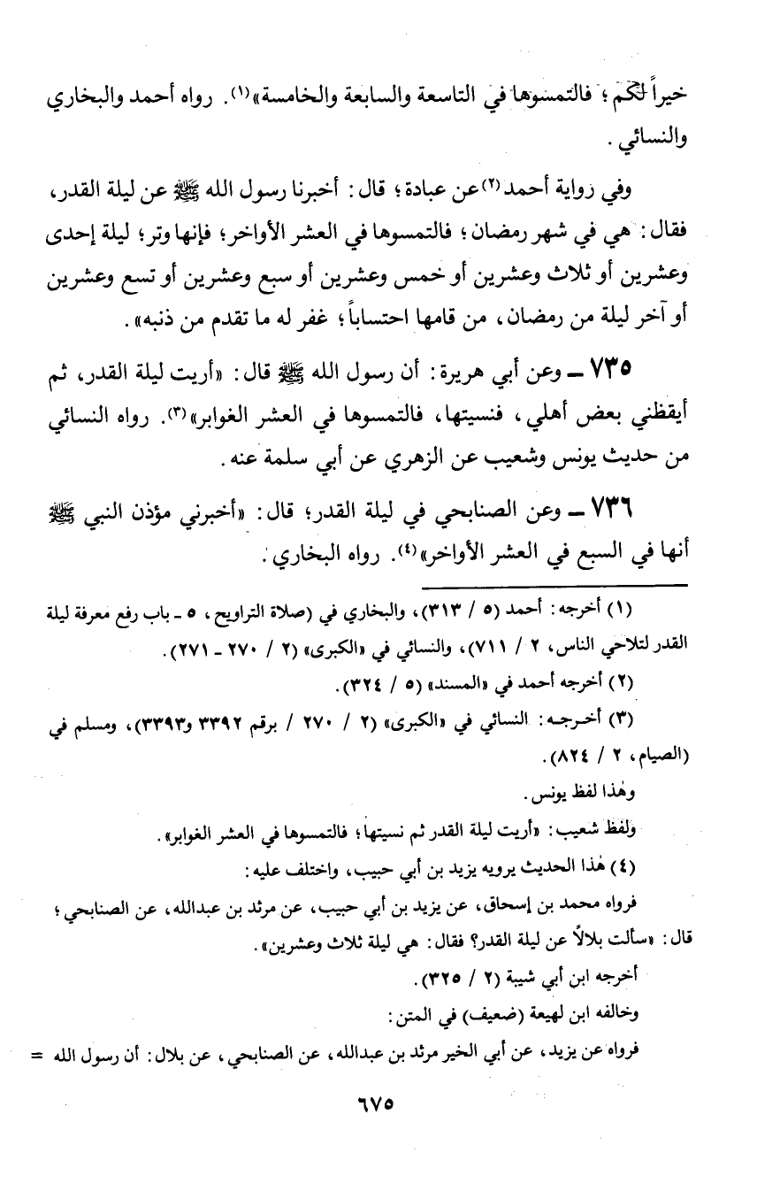 735 - وعن أبي هريرة: أن رسول الله صلى الله عليه وسلم قال: «أريت ليلة القدر, ثم أيقظني بعض أهلي, فنسيتها, فالتمسوها في العشر الغوابر». رواه النسائي من حديث يونس وشعيب عن الزهري عن أبي سلمة عنه.