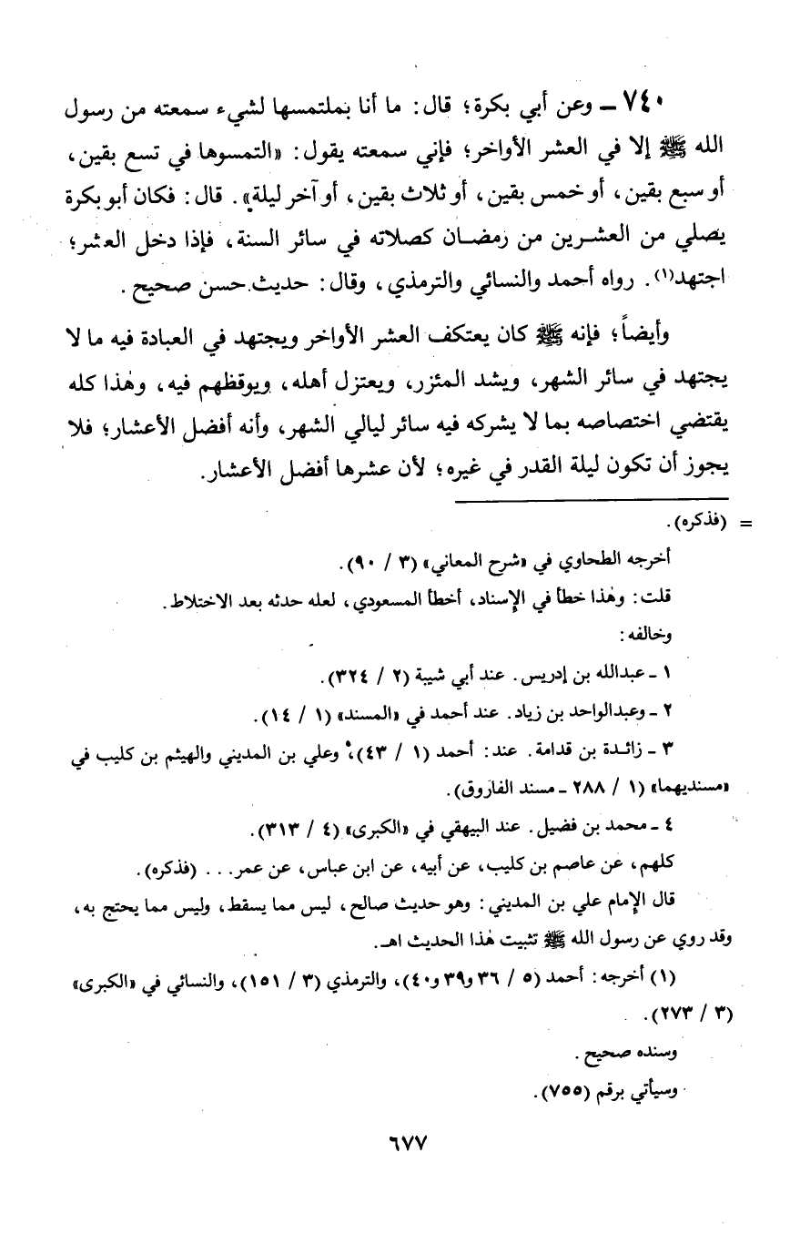 740 - وعن أبي بكرة؛ قال: ما أن بملتمسها لشيء سمعته من رسول الله صلى الله عليه وسلم إلا في العشر الأواخر؛ فإني سمعته يقول: «التمسوها في تسع بقين, أو سبع بقين, أو خمس بقين, أو ثلاث بقين, أو آخر ليلة». قال: فكان أبو بكرة يصلي من العشرين من رمضان كصلاته في سائر السنة, فإذا دخل العشر؛ اجتهد. رواه أحمد والنسائي والترمذي, وقال: حديث حسن صحيح.