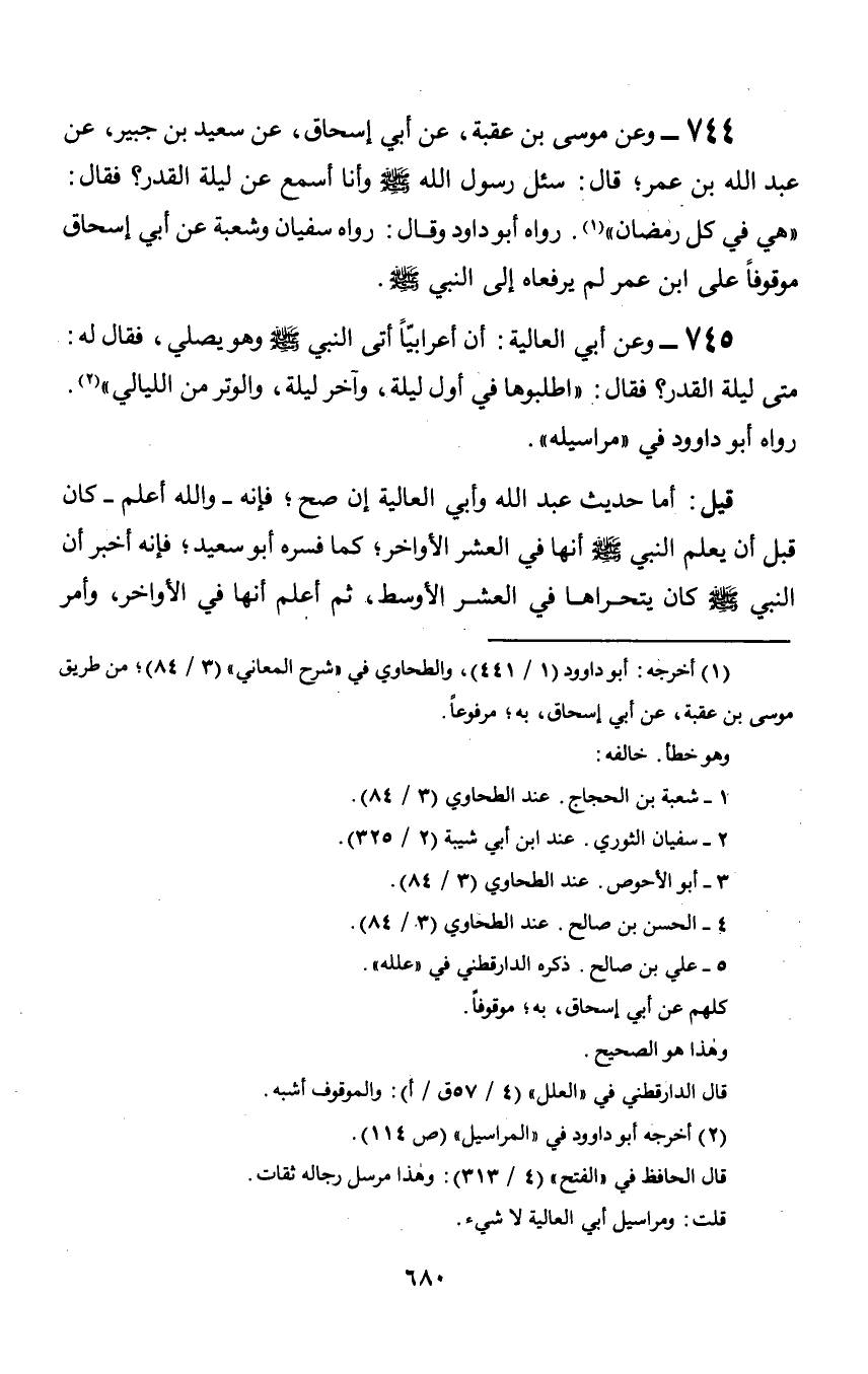 744 - وعن موسى بن عقبة, عن أبي إسحاق, عن سعيد بن جبير, عن عبد الله بن عمر؛ قال: سئل رسول الله صلى الله عليه وسلم وأنا أسمع عن ليلة القدر؟ فقال: «هي في كل رمضان». رواه أبو داود وقال: رواه سفيان وشعبة عن أبي إسحاق موقوفاً على ابن عمر لم يرفعاه إلى النبي صلى الله عليه وسلم.