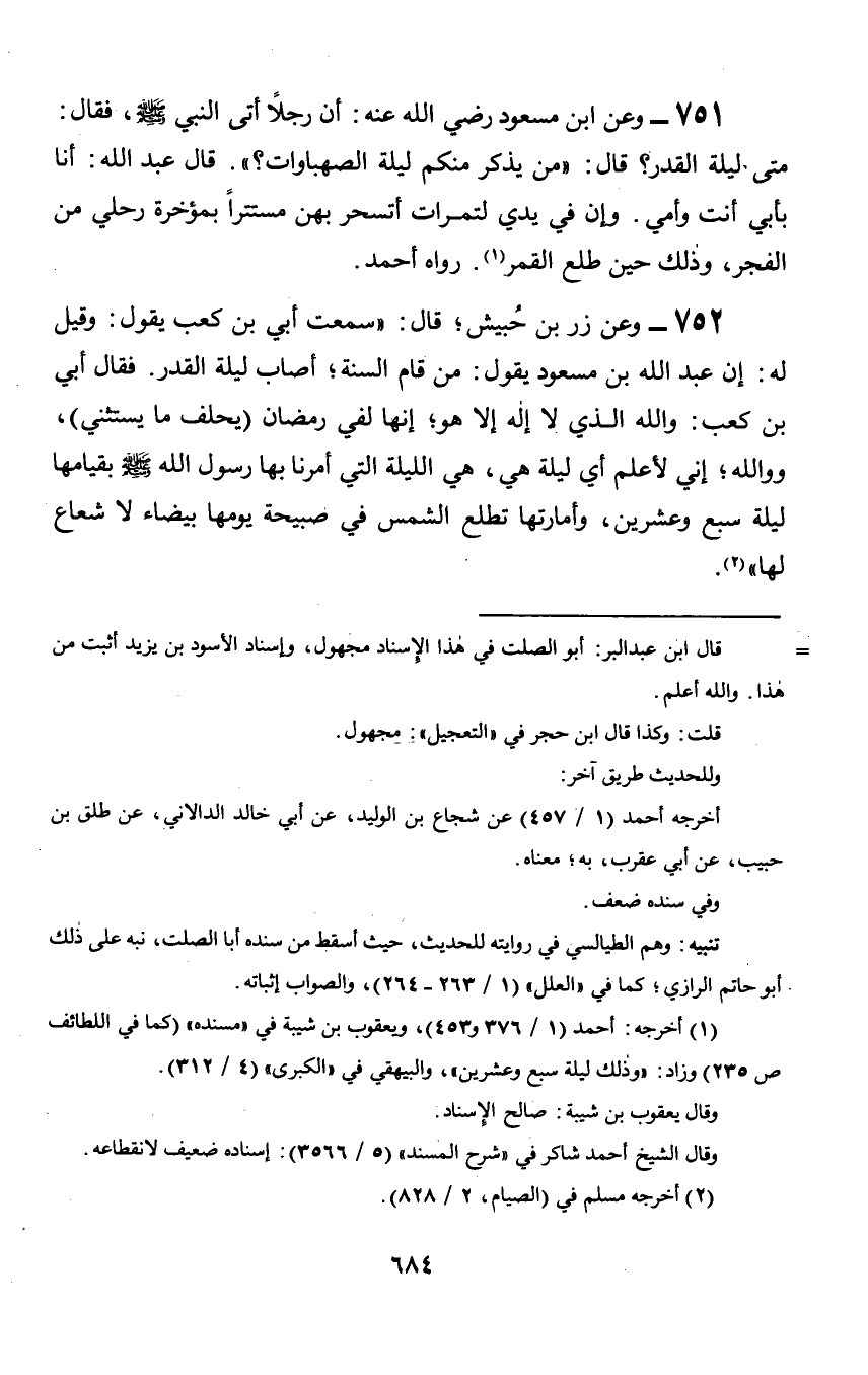 752 - وعن زر بن حُبيش؛ قال: «سمعت أبي بن كعب يقول: وقيل له: إن عبد الله بن مسعود يقول: من قام السنة؛ أصاب ليلة القدر. فقال أبي بن كعب: والله الذي لا إله إلا هو؛ إنها لفي رمضان (يحلف ما يستثني) , ووالله؛ إني لأعلم أي ليلة هي, هي الليلة التي أمرنا بها رسول الله صلى الله عليه وسلم بقيامها ليلة سبع وعشرين, وأمارتها تطلع الشمس في صبيحة يومها بيضاء لا شعاع لها».