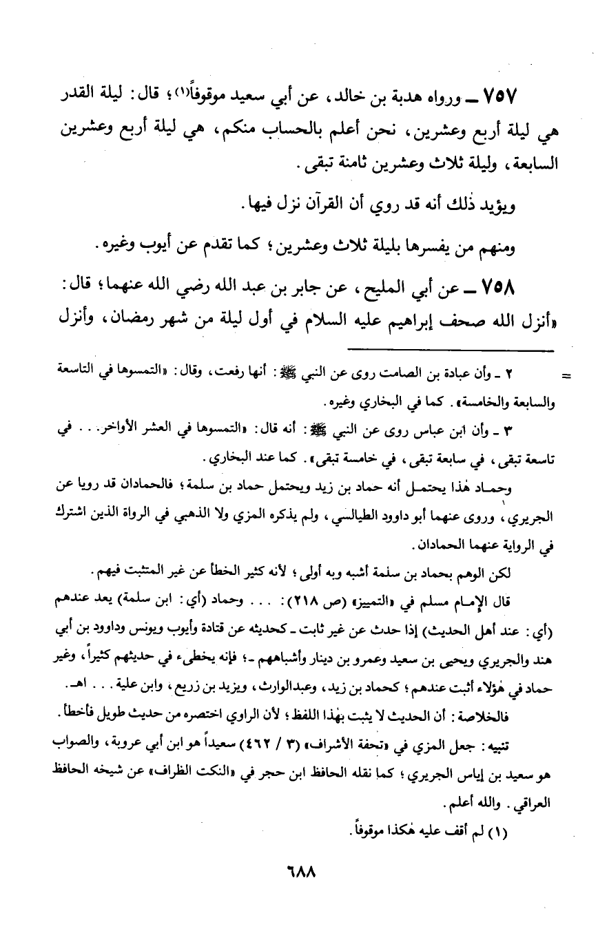 757 - ورواه هدبة بن خالد, عن أبي سعيد موقوفاً؛ قال: ليلة القدر هي ليلة أربع وعشرين, نحن أعلم بالحساب منكم, هي ليلة أربع وعشرين السابعة, وليلة ثلاث وعشرين ثامنة تبقى.
