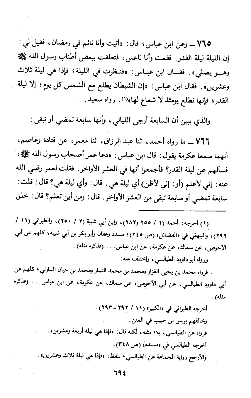 766 - ما رواه أحمد, ثنا عبد الرزاق, ثنا معمر, عن قتادة وعاصم, أنهما سمعا عكرمة يقول: قال ابن عباس: «دعا عمر أصحاب رسول الله صلى الله عليه وسلم, فسألهم عن ليلة القدر؟ فأجمعوا أنها في العشر الأواخر. فقلت لعمر رضي الله عنه: إني لأعلم (أو: إني لأظن) أي ليلة هي. قال: وأي ليلة هي؟ قال: قلت: سابعة تمضي أو سابعة تبقى من العشر الأواخر. قال: ومن أين تعلم؟ قال: خلق