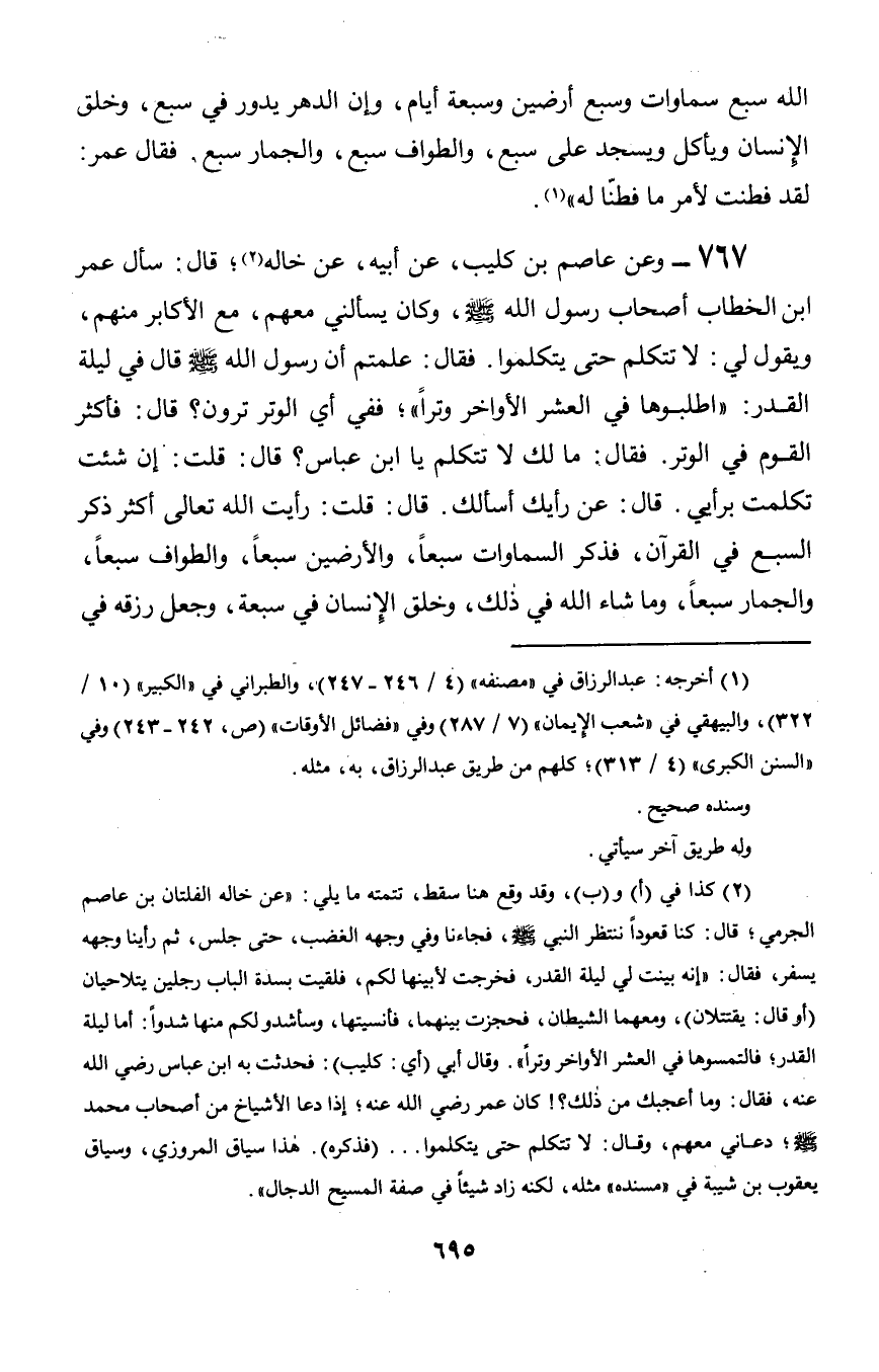 767 - وعن عاصم بن كليب, عن أبيه, عن خاله؛ قال: سأل عمر ابن الخطاب أصحاب رسول الله صلى الله عليه وسلم, وكان يسألني معهم, مع الأكابر منهم, ويقول لي: لا تتكلم حتى يتكلموا. فقال: علمتم أن رسول الله صلى الله عليه وسلم قال في ليلة القدر: «اطلبوها في العشر الأواخر وتراً»؛ ففي أي الوتر ترون؟ قال: فأكثر القوم في الوتر. فقال: ما لك لا تتكلم يا ابن عباس؟ قال: قلت: إن شئت تكلمت برأيي. قال: عن رأيك أسألك. قال: قلت: رأيت الله تعالى أكثر ذكر السبع في القرآن, فذكر السماوات سبعاً, والأرضين سبعاً, والطواف سبعاً, والجمار سبعاً, وما شاء الله في ذلك, وخلق الإِنسان في سبعة, وجعل رزقه في