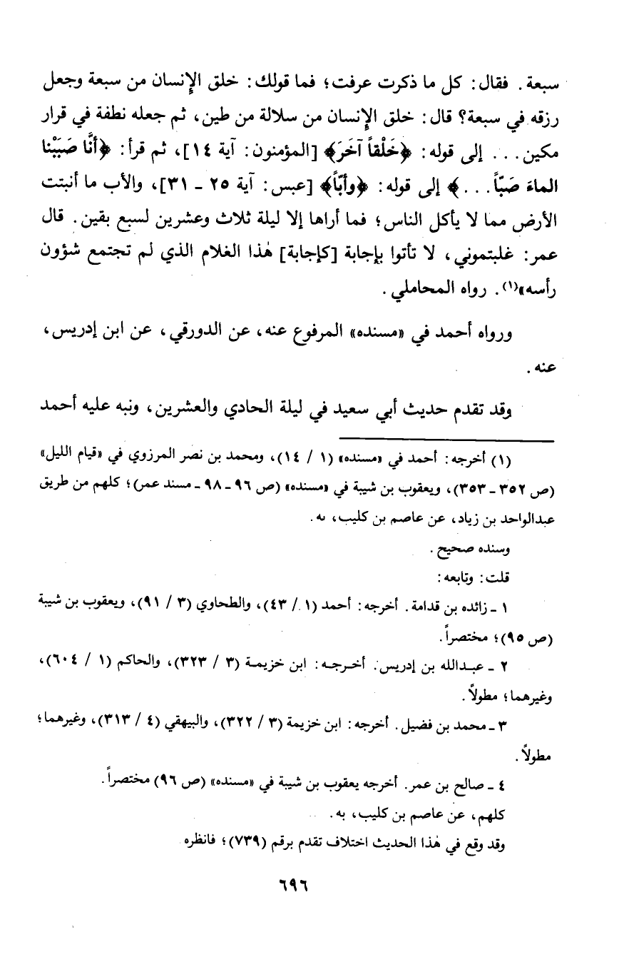 سبعة. فقال: كل ما ذكرت عرفت؛ فما قولك: خلق الإِنسان من سبعة وجعل رزقه في سبعة؟ قال: خلق الإِنسان من سلالة من طين, ثم جعله نطفة في قرار مكين. . . إلى قوله: {خَلْقًا آخَرَ} [المؤمنون: آية 14] , ثم قرأ: {أَنَّا صَبَبْنَا الْمَاءَ صَبًّا. . .} إلى قوله: {وَأَبًّا} [عبس: آية 25 - 31] , والأب ما أنبتت الأرض مما لا يأكل الناس؛ فما أراها إلا ليلة ثلاث وعشرين لسبع بقين. قال عمر: غلبتموني, لا تأتوا بإجابة [كإجابة] هذا الغلام الذي لم تجتمع شؤون رأسه». رواه المحاملي.
