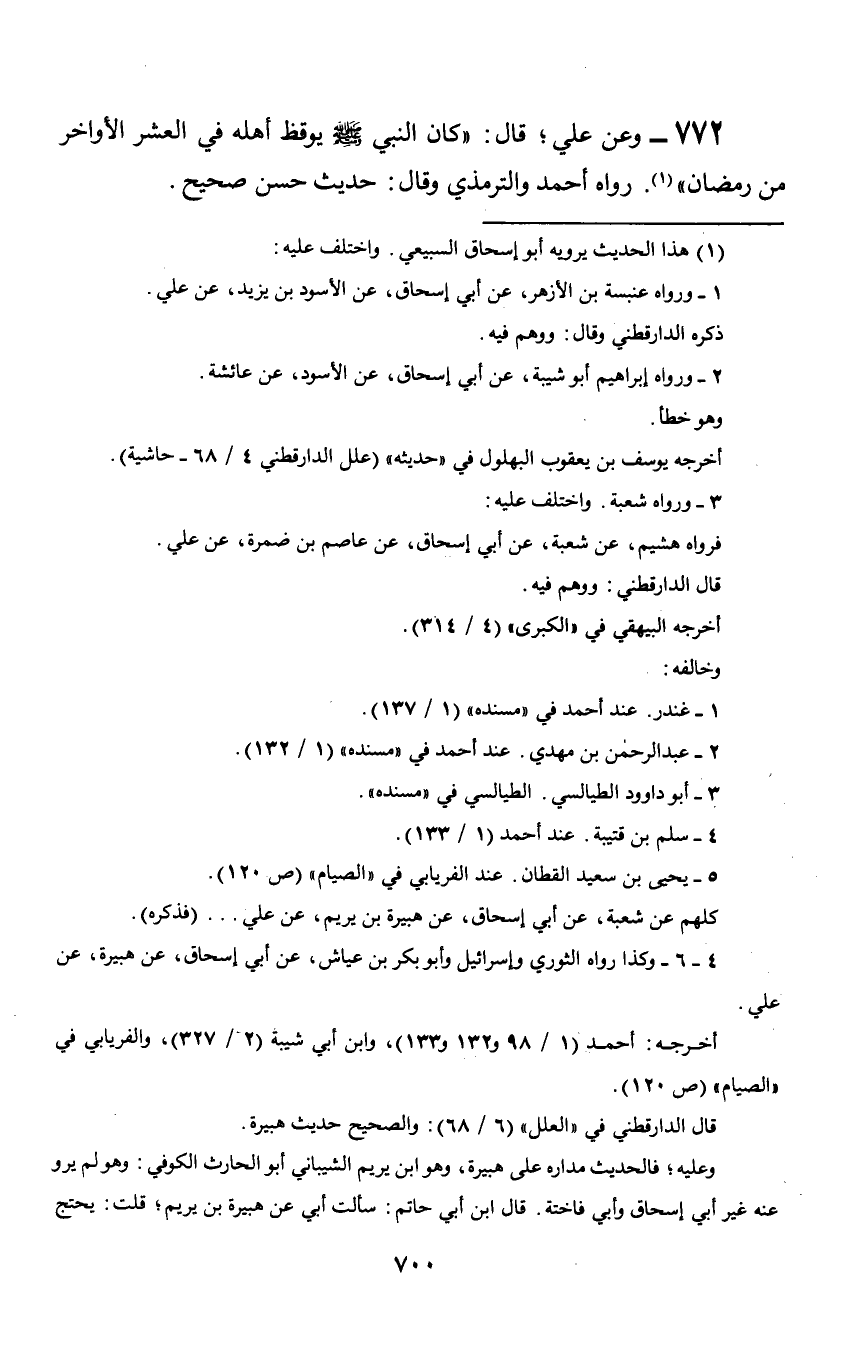 772 - وعن علي؛ قال: «كان النبي صلى الله عليه وسلم يوقظ أهله في العشر الأواخر من رمضان». رواه أحمد والترمذي وقال: حديث حسن صحيح.