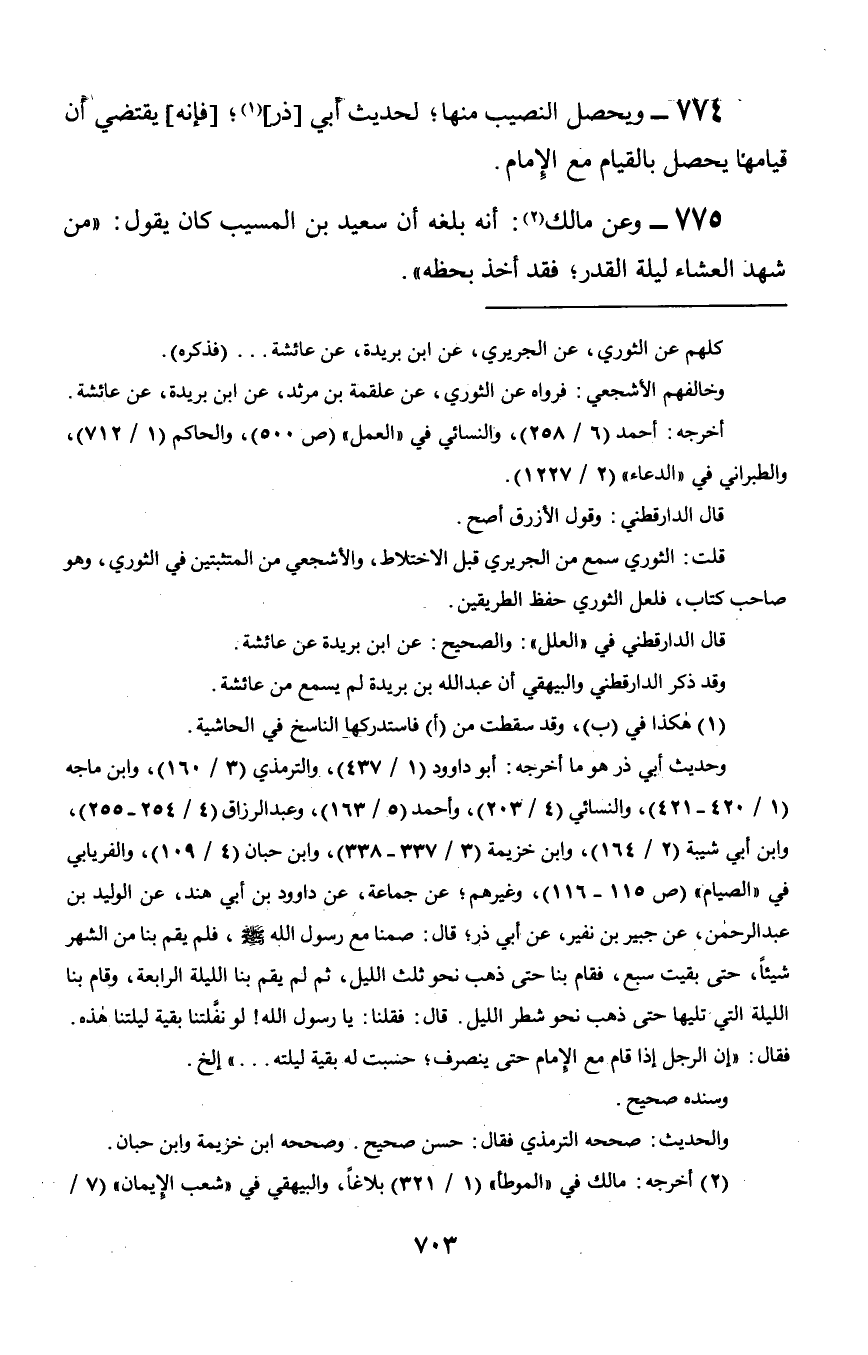 774 - ويحصل النصيب منها؛ لحديث أبي [ذر]؛ [فإنه] يقتضي أن قيامها يحصل بالقيام مع الإِمام.