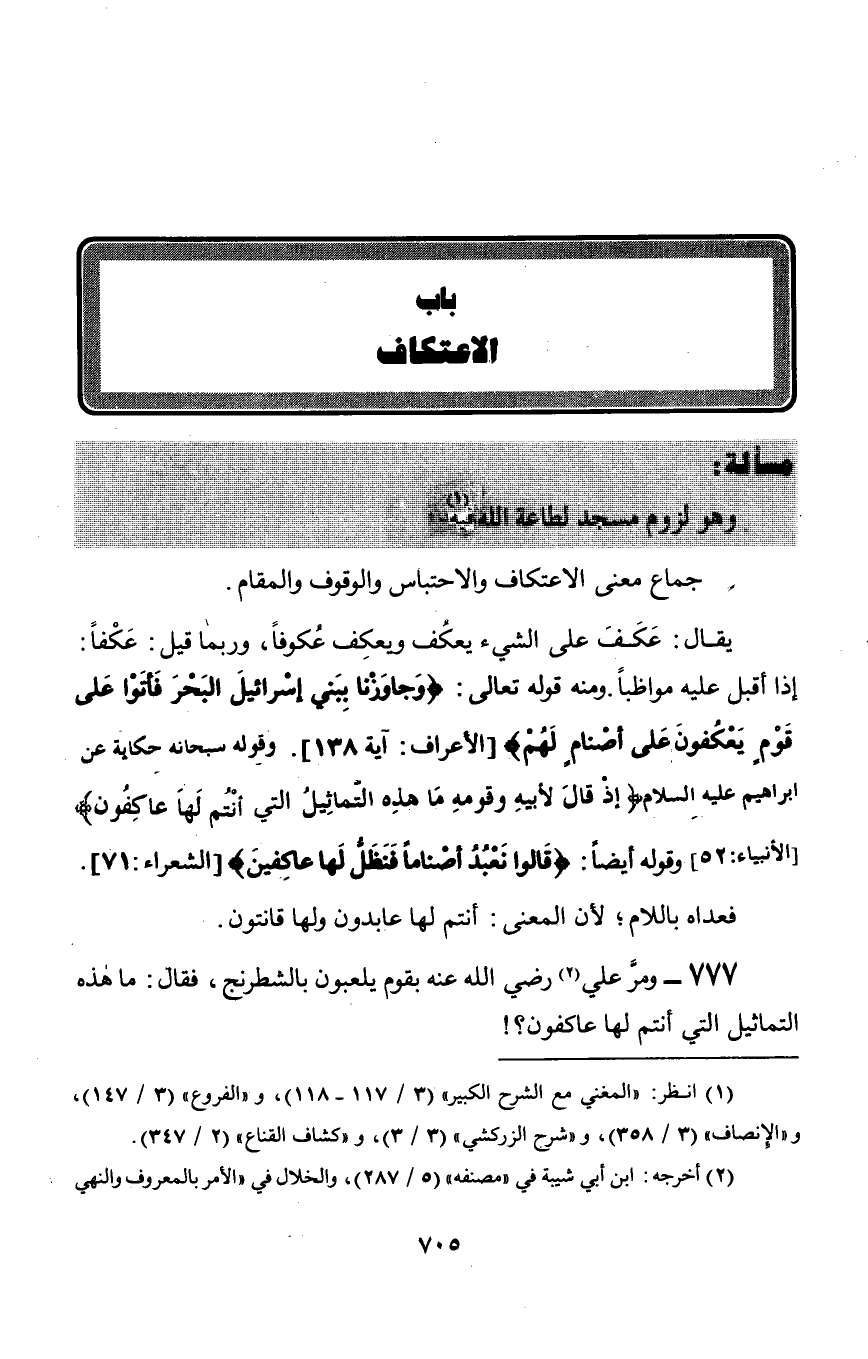 يقال: عَكَفَ على الشيء يعكُف ويعكِف عُكوفاً, وربما قيل: عَكْفاً: إذا أقبل عليه مواظباً. ومنه قوله تعالى: {وَجَاوَزْنَا بِبَنِي إِسْرَائِيلَ الْبَحْرَ فَأَتَوْا عَلَى قَوْمٍ يَعْكُفُونَ عَلَى أَصْنَامٍ لَهُمْ} [الأعراف: آية 138]. وقوله سبحانه حكاية عن إبراهيم عليه السلام {إِذْ قَالَ لِأَبِيهِ وَقَوْمِهِ مَا هَذِهِ التَّمَاثِيلُ الَّتِي أَنْتُمْ لَهَا عَاكِفُونَ} [الأنبياء: 52] وقوله أيضاً: {قَالُوا نَعْبُدُ أَصْنَامًا فَنَظَلُّ لَهَا عَاكِفِينَ} [الشعراء: 71].