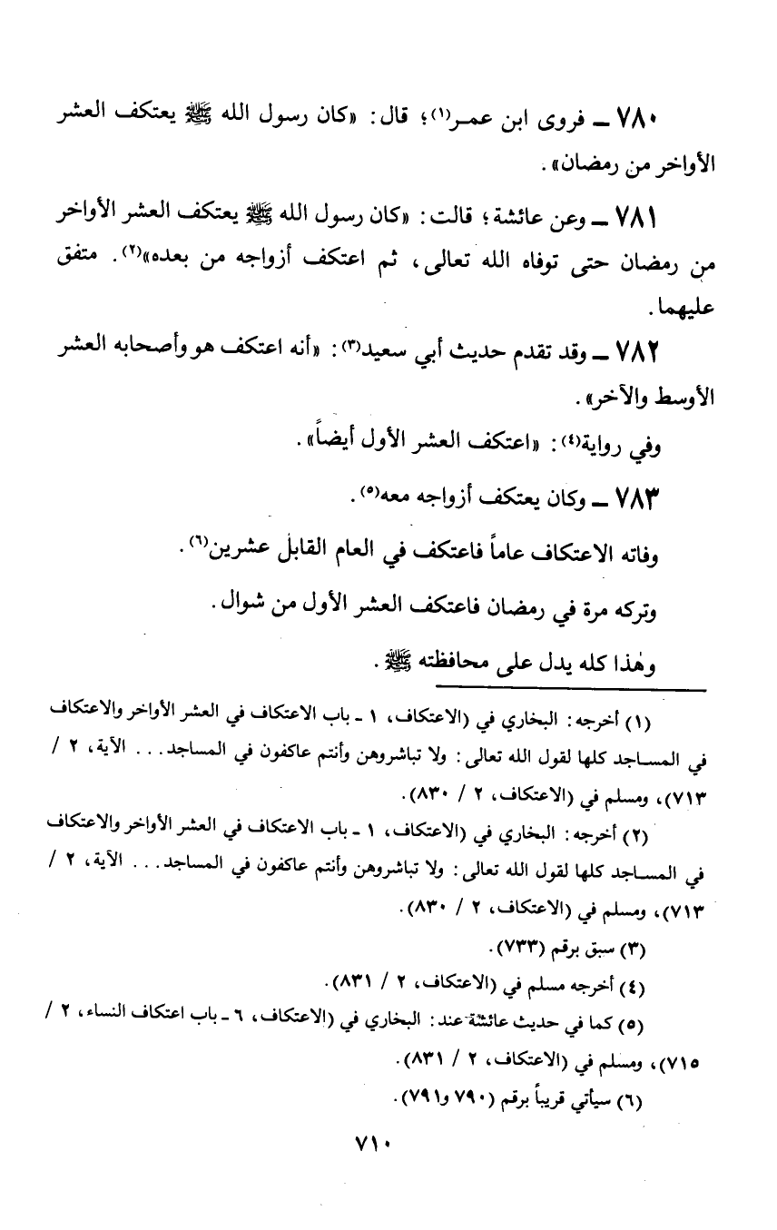 780 - فروى ابن عمر؛ قال: «كان رسول الله صلى الله عليه وسلم يعتكف العشر الأواخر من رمضان».