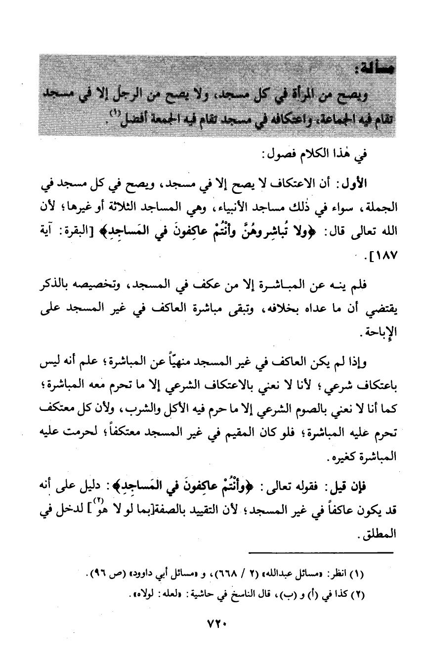 الأول: أن الاعتكاف لا يصح إلا في مسجد, ويصح في كل مسجد في الجملة, سواء في ذلك مساجد الأنبياء, وهي المساجد الثلاثة أو غيرها؛ لأن الله تعالى قال: {وَلَا تُبَاشِرُوهُنَّ وَأَنْتُمْ عَاكِفُونَ فِي الْمَسَاجِدِ} [البقرة: آية 187].