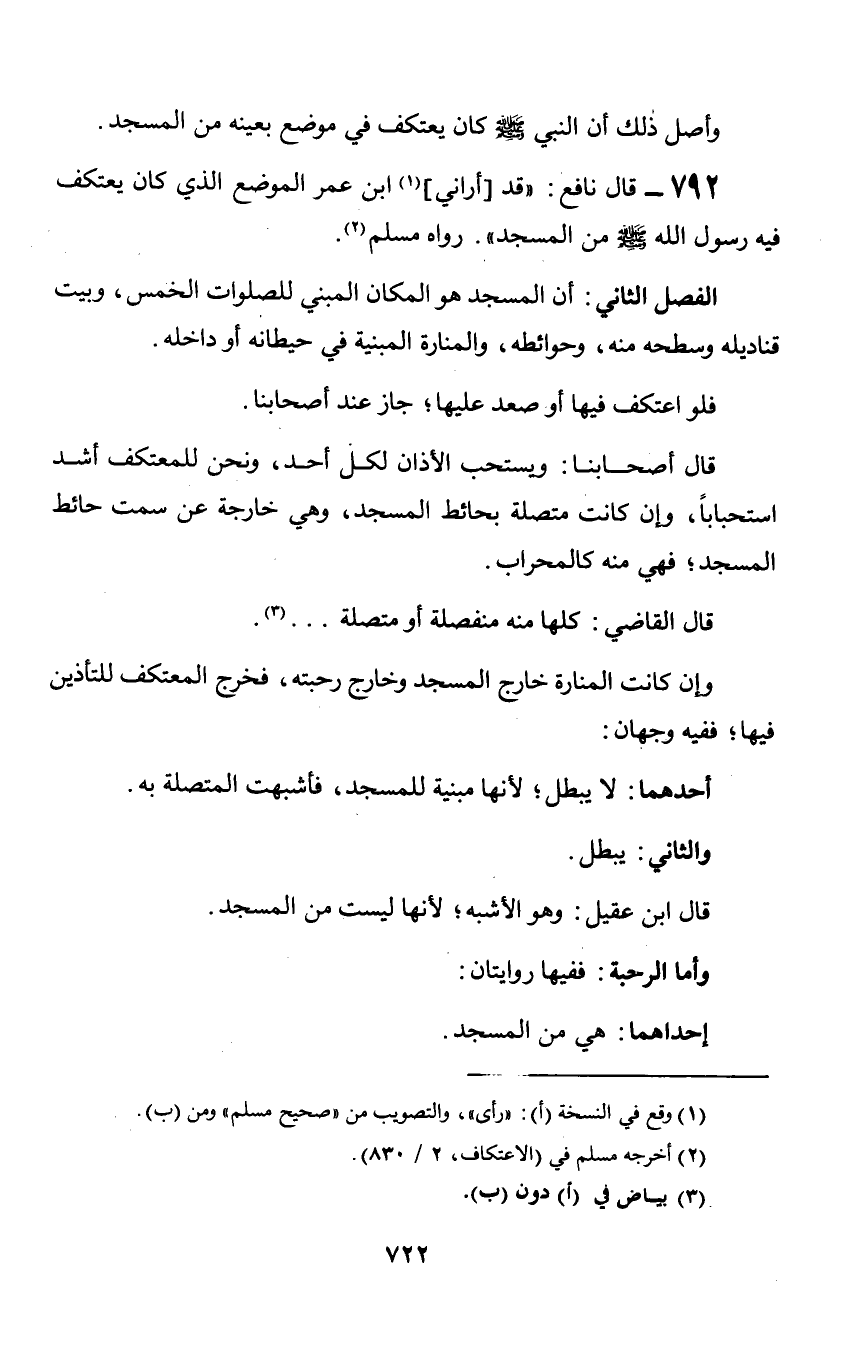 792 - قال نافع: «قد [أراني] ابن العمر الموضع الذي كان يعتكف فيه رسول الله صلى الله عليه وسلم من المسجد». رواه مسلم.