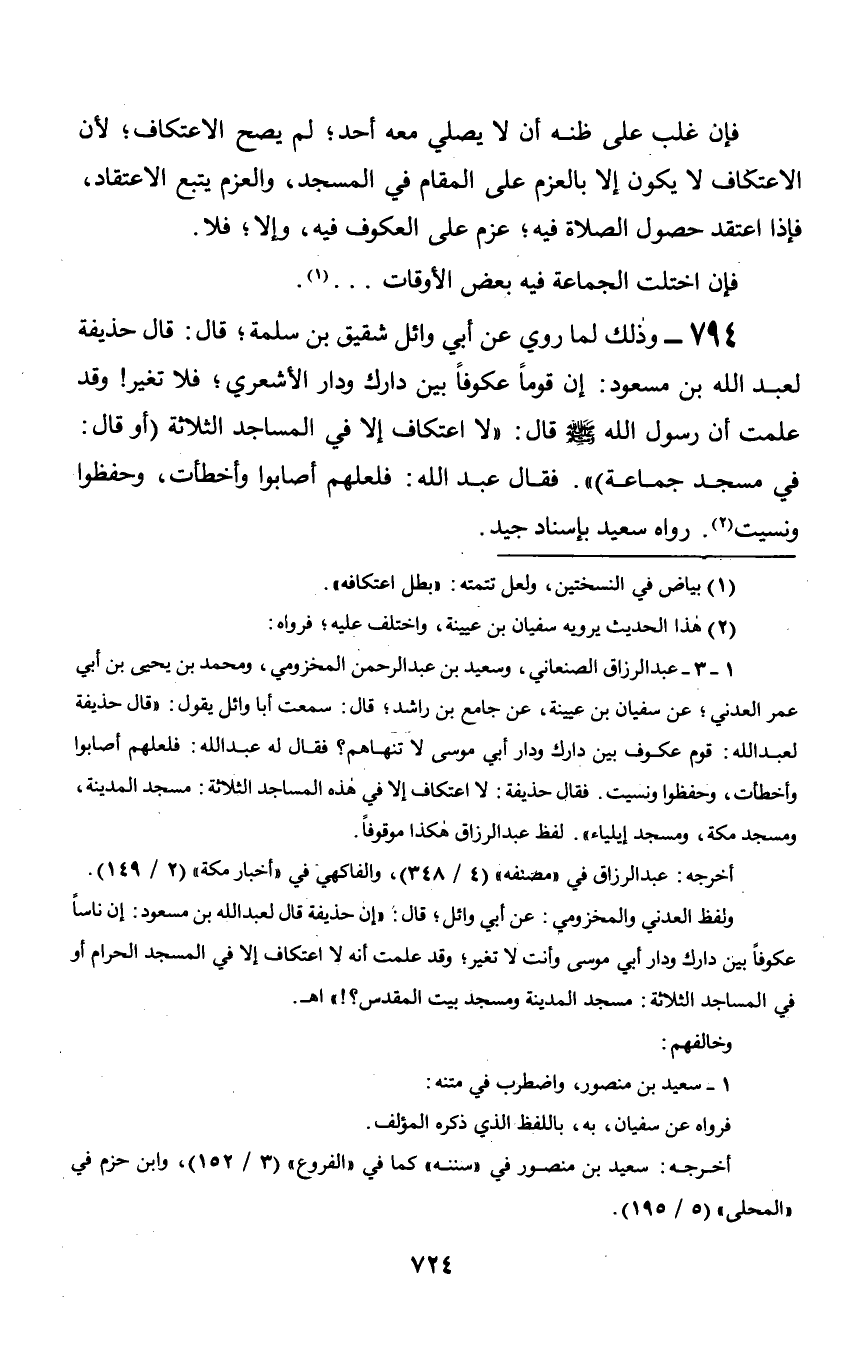 794 - وذلك لما روي عن أبي وائل شقيق بن سلمة؛ قال: قال حذيفة لعبد الله بن مسعود: إن قوماً عكوفاً بين دارك ودار الشعري؛ فلا تغير! وقد علمت أن رسول الله صلى الله عليه وسلم قال: «لا اعتكاف إلا في المساجد الثلاثة (أو قال: في مسجد جماعة»). فقال عبد الله: فلعلهم أصابوا وأخطأت, وحفظوا ونسيت. رواه سعيد بإسناد جيد.