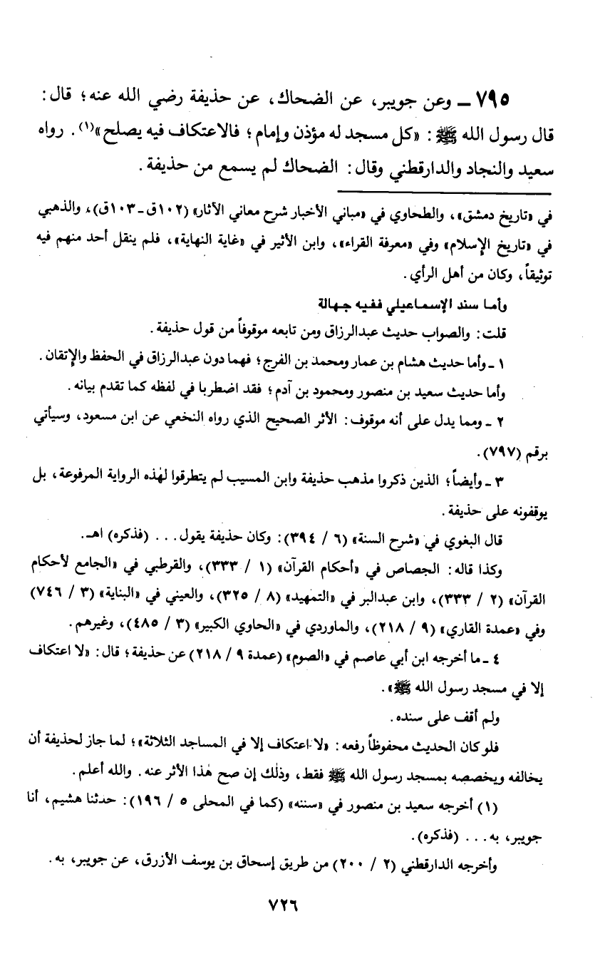 795 - وعن جويبر, عن الضحاك, عن حذيفة رضي الله عنه؛ قال: قال رسول الله صلى الله عليه وسلم: «كل مسجد له مؤذن وإمام؛ فالاعتكاف فيه يصلح». رواه سعيد والنجاد والدارقطني وقال: الضحاك لم يسمع من حذيفة.