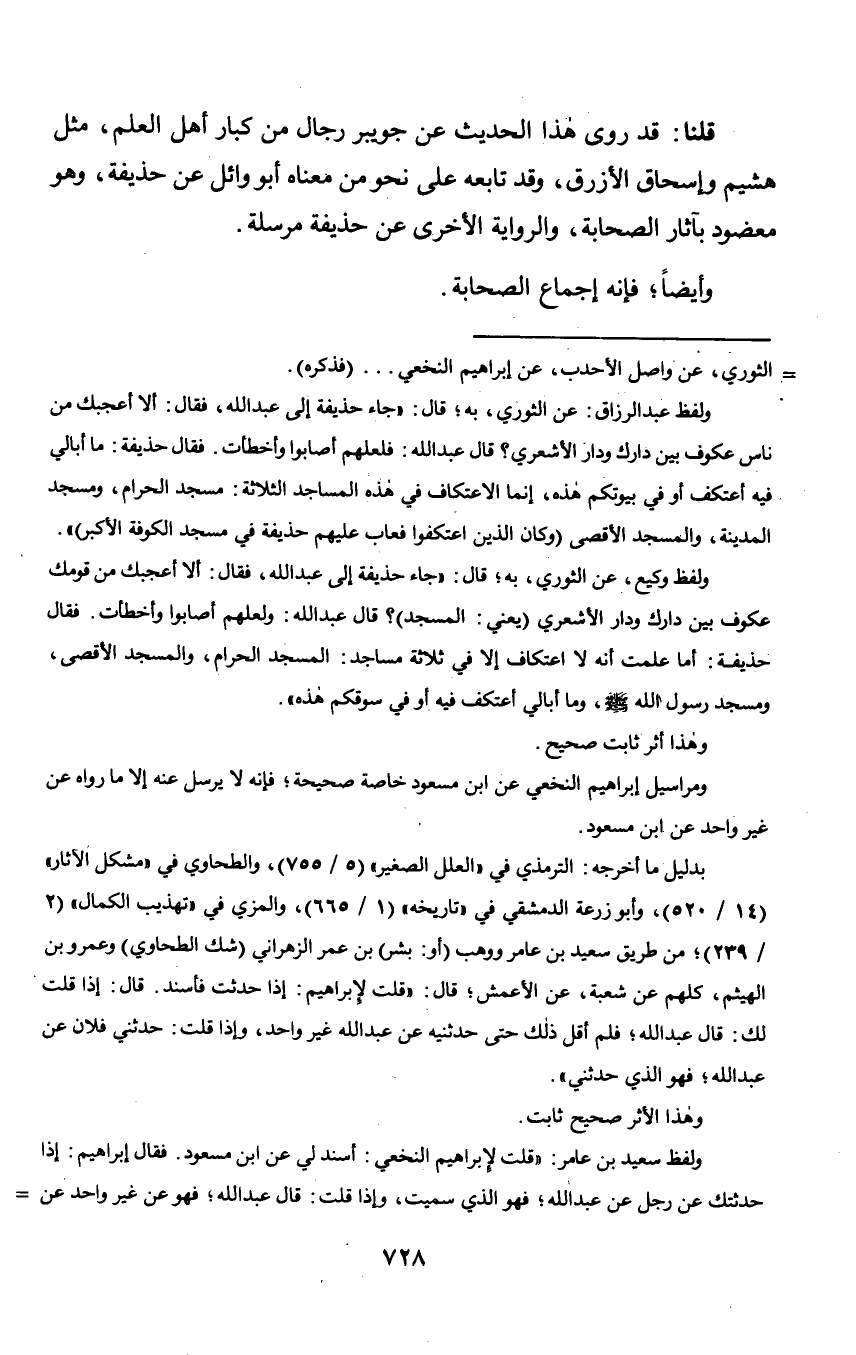 قلنا: قد روى هذا الحديث عن جويبر رجال من كبار أهل العلم, مثل هشيم وإسحاق والأزرق, وقد تابعه على نحو من معناه أبو وائل عن حذيفة, وهو معضود بآثار الصحابة, والرواية الأخرى عن حذيفة مرسلة.