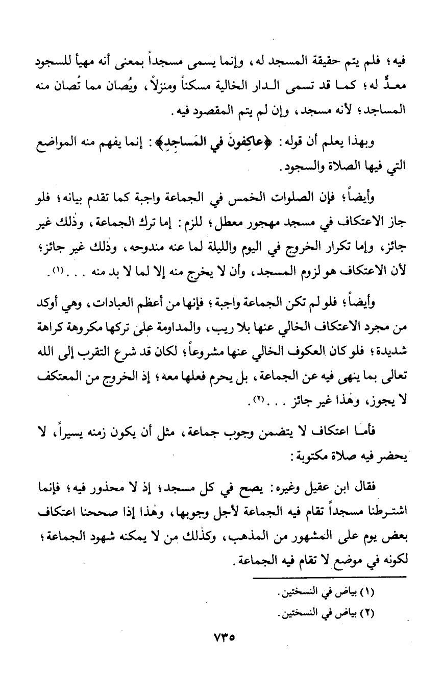 وأيضاً؛ فإن الصلوات الخمس في الجماعة واجبة كما تقدم بيانه؛ فلو جاز الاعتكاف في مسجد مهجور معطل؛ للزم: إما ترك الجماعة, وذلك غير جائز, وإما تكرار الخروج في اليوم والليلة لما عنه مندوحه, وذلك غير جائز؛ لأن الاعتكاف هو لزوم المسجد, وأن لا يخرج منه إلا لما لا بد منه. . . .
