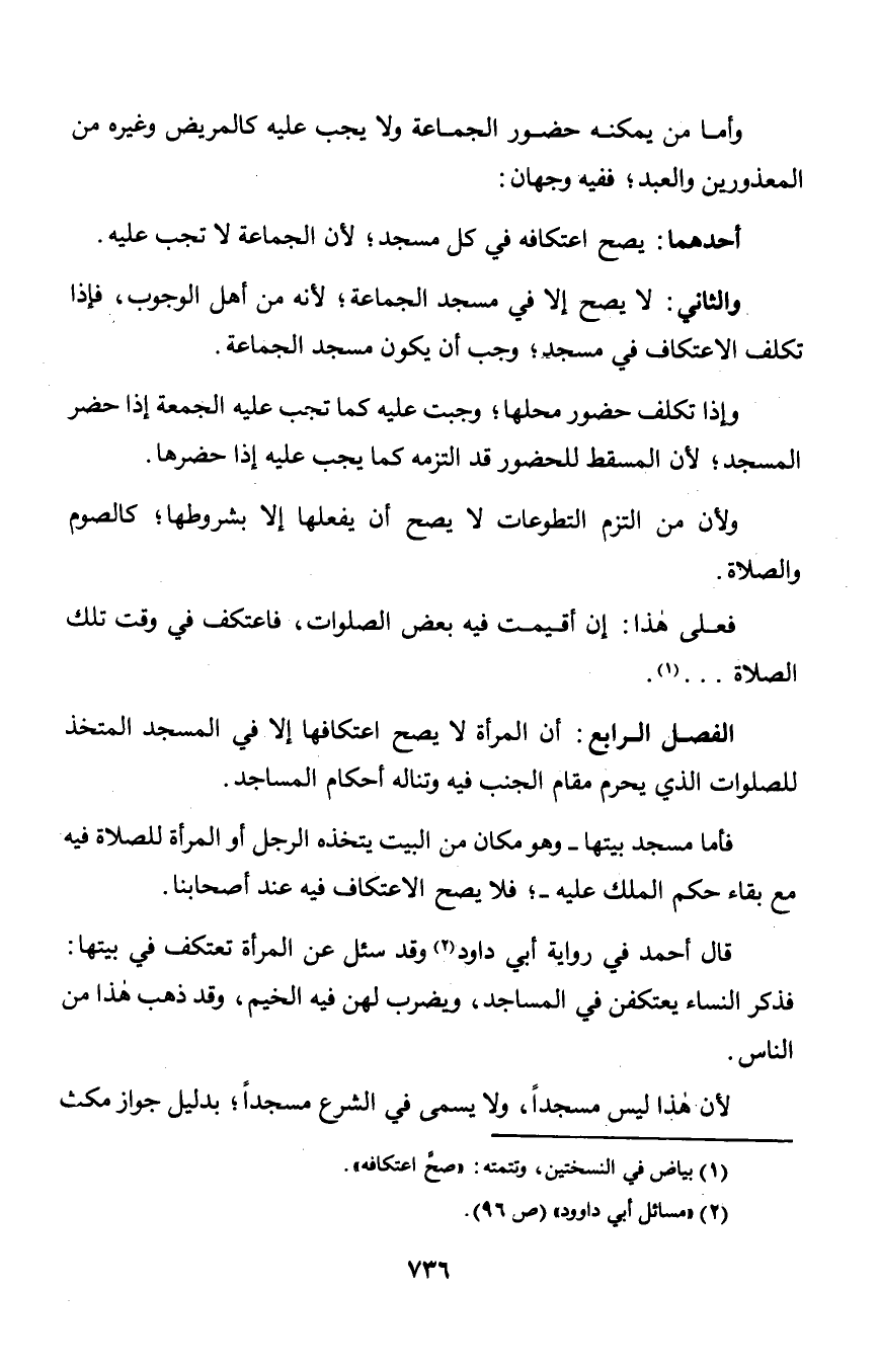 الفصل الرابع: أن المرأة لا يصح اعتكافها إلا في المسجد المتخذ للصلوات الذي يحرم مقام الجنب فيه وتناله أحكام المساجد.