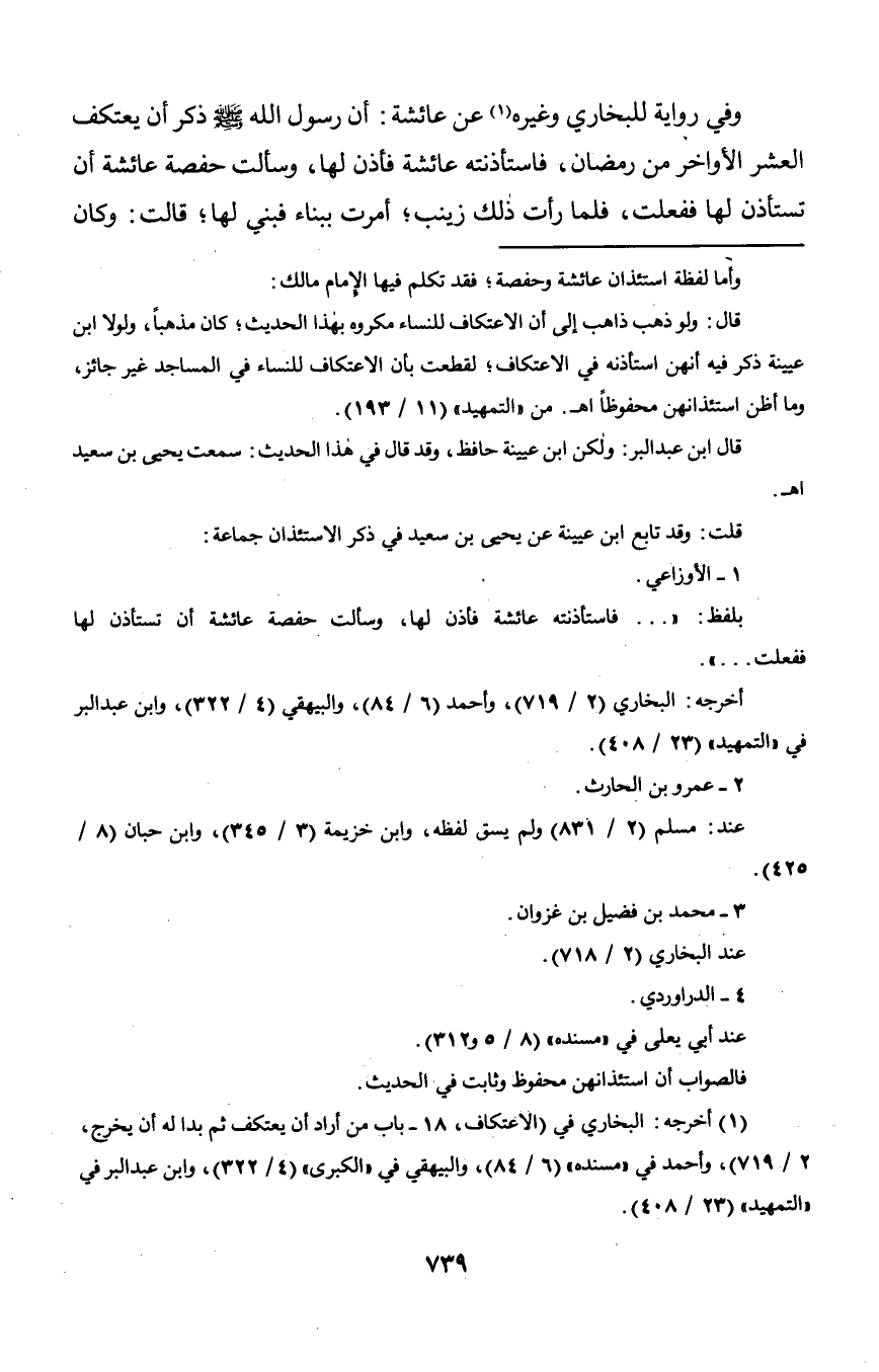 وفي رواية للبخاري وغيره عن عائشة: أن رسول الله صلى الله عليه وسلم ذكر أن يعتكف العشر الأواخر من رمضان, فاستأذنته عائشة فأذن لها, وسألت حفصة عائشة ـن تستأذن لها ففعلت, فلما رأت ذلك زينب؛ أمرت ببناء فبني لها؛ قالت: كان