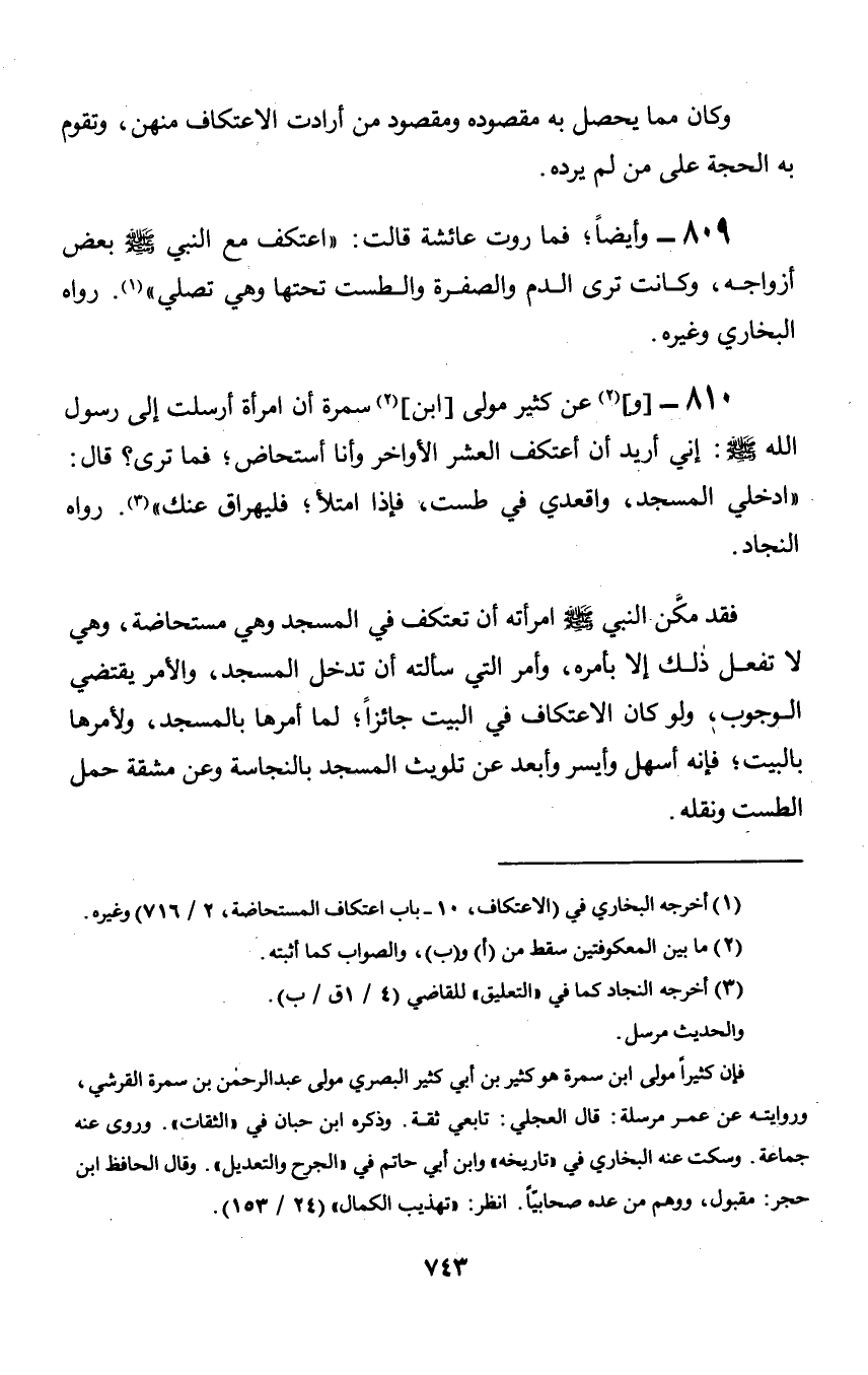 810 - [و] عن كثير مولى [ابن] سمرة أن امرأة أرسلت إلى رسول الله صلى الله عليه وسلم: إني أريد أن أعتكف العشر الأواخر وأنا أستحاض؛ فما ترى؟ قال: «ادخلي المسجد, واقعدي في طست, فإذا امتلأ؛ فليهراق عنك». رواه النجاد.