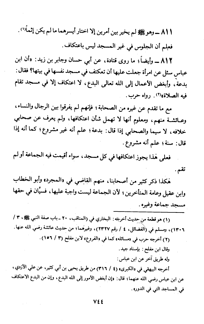 812 - وأيضا؛ ما روى قتادة, عن أبي حسان وجابر بن زيد: «أن ابن عباس سئل عن امرأة جعلت عليها أن تعتكف في مسجد نفسها في بيتها؟ فقال: بدعة, وأبغض الأعمال إلى الله تعالى البدع, لا اعتكاف إلا في مسجد تقام فيه الصلاة». رواه حرب.