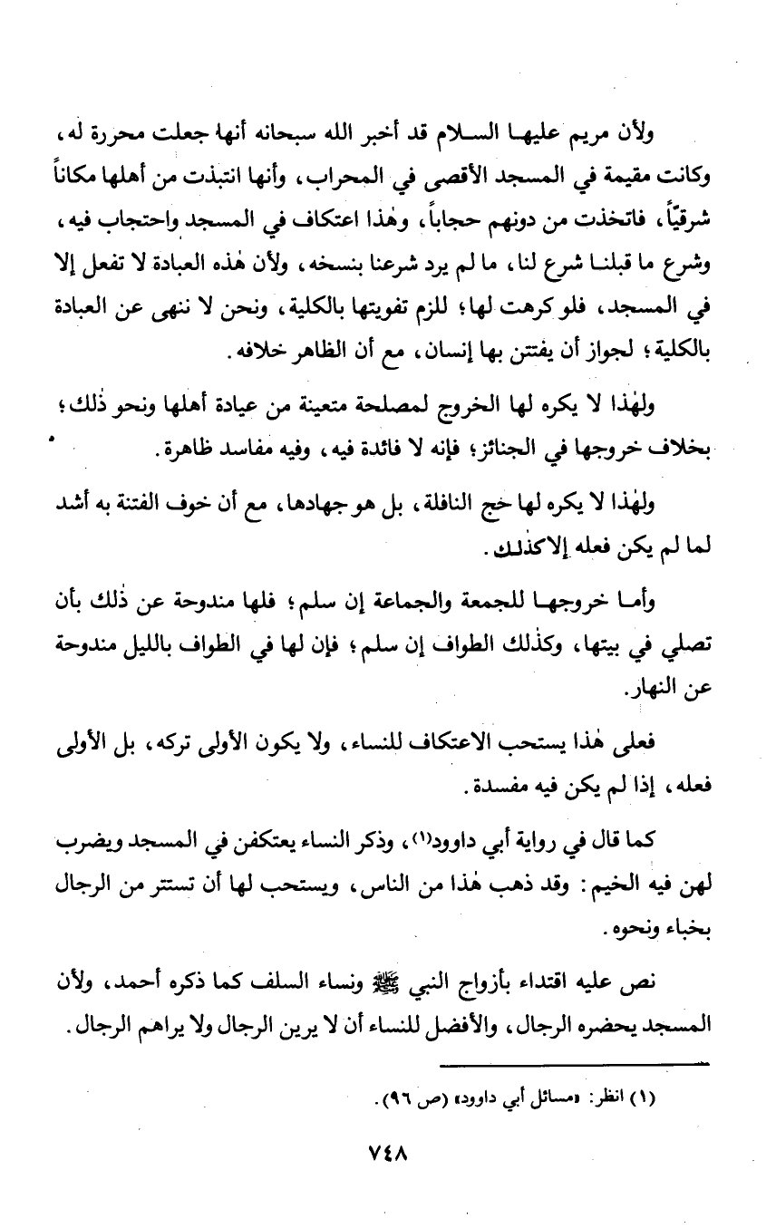ولأن مريم عليها السلام قد اخبر الله سبحانه أنها جعلت محررة له, وكانت مقيمة في المسجد الأقصى في المحراب, وأنها انتبذت من أهلها مكاناً شرقيّاً, فاتخذت من دونهم حجاباً, وهذا اعتكاف في المسجد واحتجاب فيه, وشرع ما قبلنا شرع لنا, ما لم يرد شرعنا بنسخه, ولأن هذه العبادة لا تفعل إلا في المسجد, فلو كرهت لها؛ للزم تفويتها بالكلية, ونحن لا ننهى عن العبادة بالكلية؛ لجواز أن يفتتن بها إنسان, مع أن الظاهر خلافه.