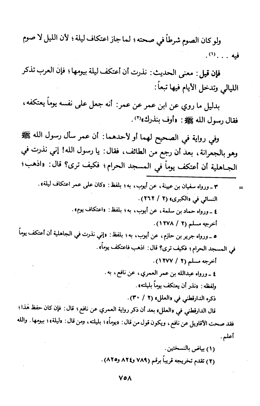 ولو كان الصوم شرطاً في صحته؛ لما جاز اعتكاف ليلة؛ لأن الليل لا صوم فيه. . . .
