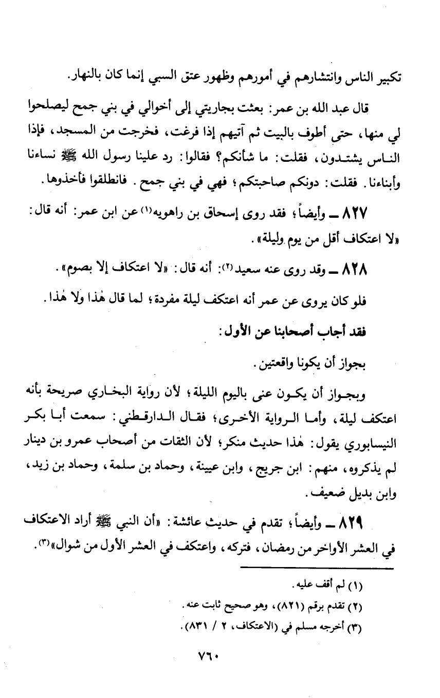 827 - وأيضاً؛ فقد روى إسحاق بن راهوية عن ابن عمر: أنه قال: «لا اعتكاف أقل من يوم وليلة».