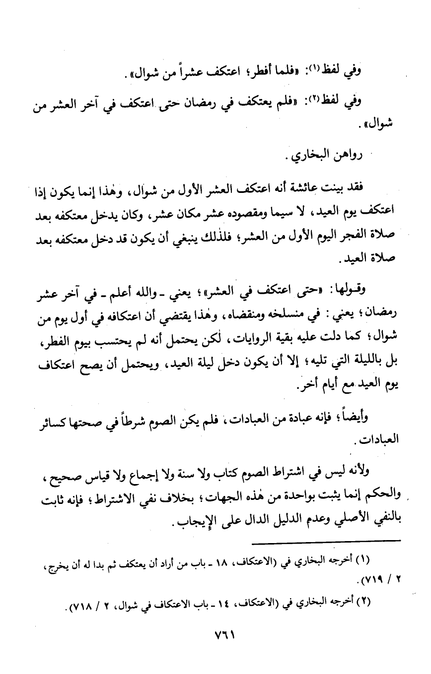 ولأنه ليس فيه اشتراط الصوم كتاب ولا سنة ولا إجماع ولا قياس صحيح, والحكم إنما يثبت بواحدة من هذه الجهات؛ بخلاف نفي الاشتراط؛ فإنه ثابت بالنفي الأصلي وعدم الدليل الدال على الإِيجاب.