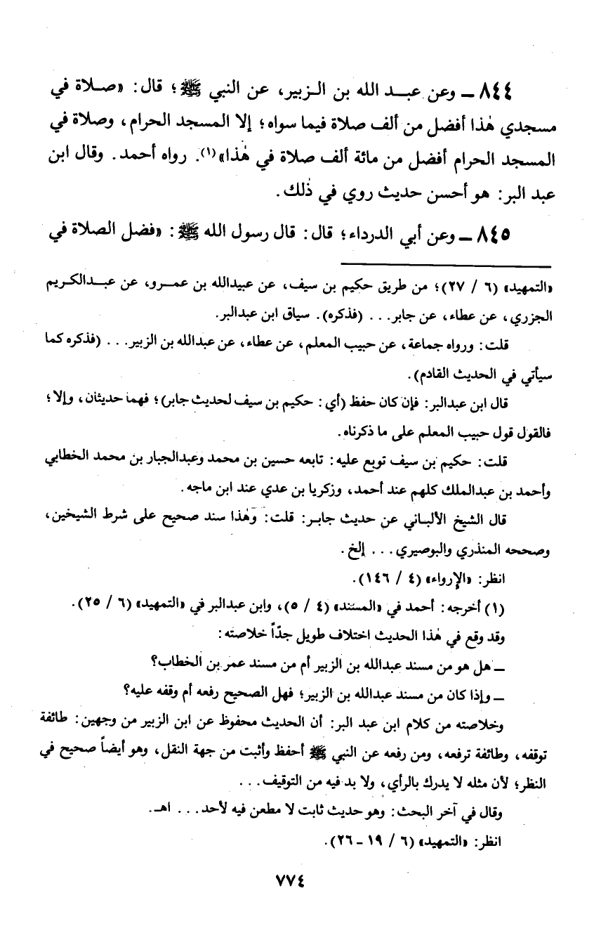 844 - وعن عبد الله بن الزبير, عن النبي صلى الله عليه وسلم؛ قال: «صلاة في مسجدي هذا أفضل من ألف صلاة فيما سواه؛ إلا المسجد الحرام, وصلاة في المسجد الحرام أفضل من مائة ألف صلاة في هذا». رواه أحمد. وقال ابن عبد البر: هو أحسن حديث روي في ذلك.