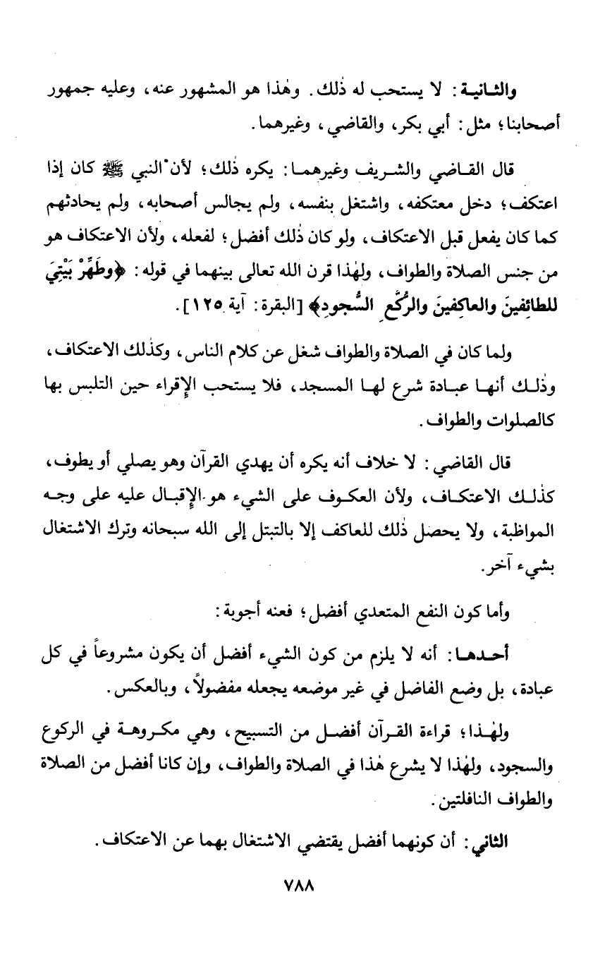 ولما كان في الصلاة والطواف شغل عن كلام الناس, وكذلك الاعتكاف, وذلك أنها عبادة شرع لها المسجد, فلا يستحب الإِقراء حين التلبس بها كالصلوات والطواف.