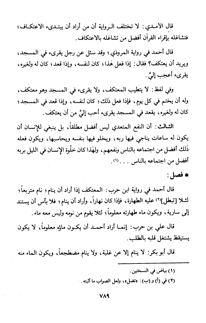 قال أحمد في رواية ابن حرب: المعتكف إذا أراد أن ينام؛ نام متربعاً؛ لئلا [تبطل] عليه الطهارة, فإذا كان نهاراً, وأراد أن ينام؛ فلا بأس أن يستند إلى سارية, ويكون ماء طهارته معلوماً؛ لئلا يقوم من نومه وليس معه ماء.