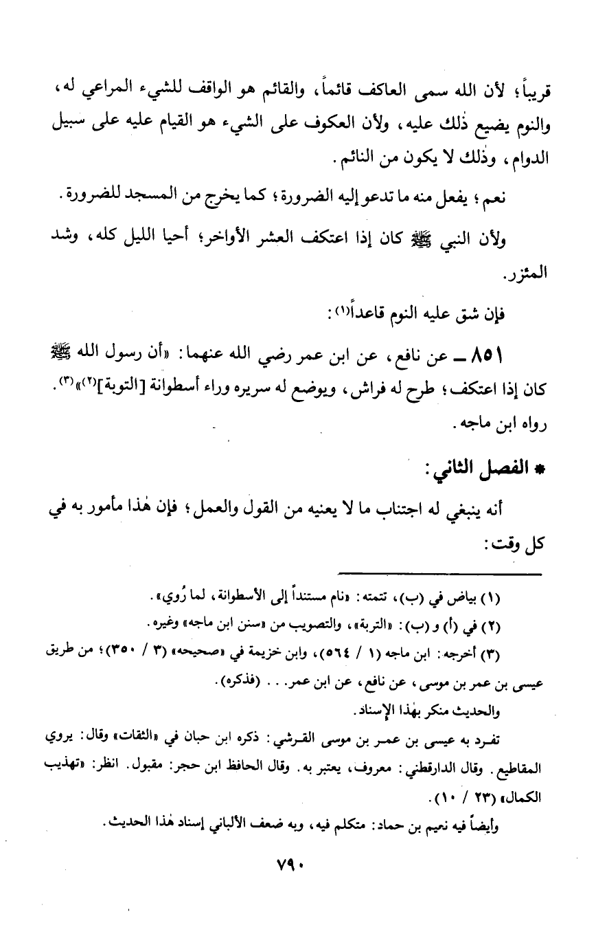 851 - عن نافع, عن ابن عمر رضي الله عنهما: «أن رسول الله صلى الله عليه وسلم كان إذا اعتكف؛ طرح له فراش, ويوضع له سريره وراء أسطوانة [التوبة]». رواه ابن ماجه.