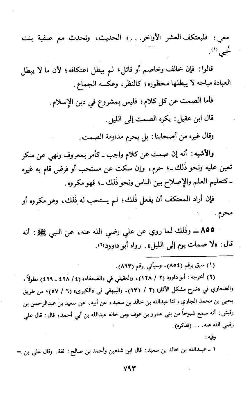 855 - وذلك لما روي عن علي رضي الله عنه, عن النبي صلى الله عليه وسلم: أنه قال: «لا صمات يوم إلى الليل». رواه أبو داوود.